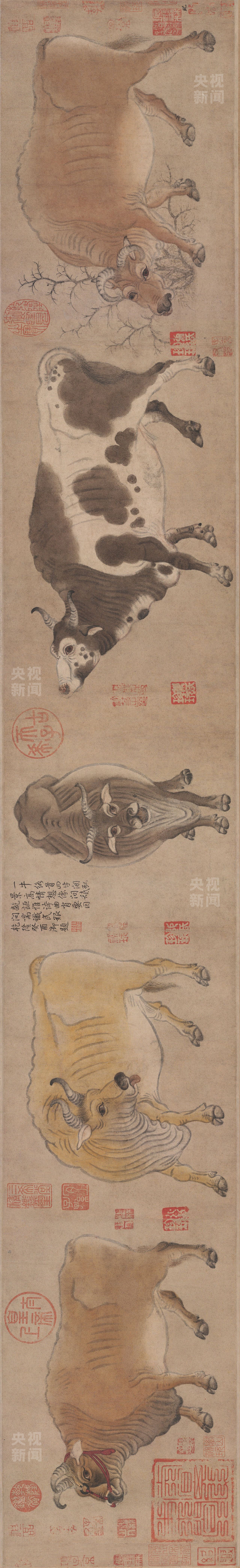 《五牛图》卷,唐,韩滉作,纸本,设色,纵20.8厘米,横139.8厘米。
