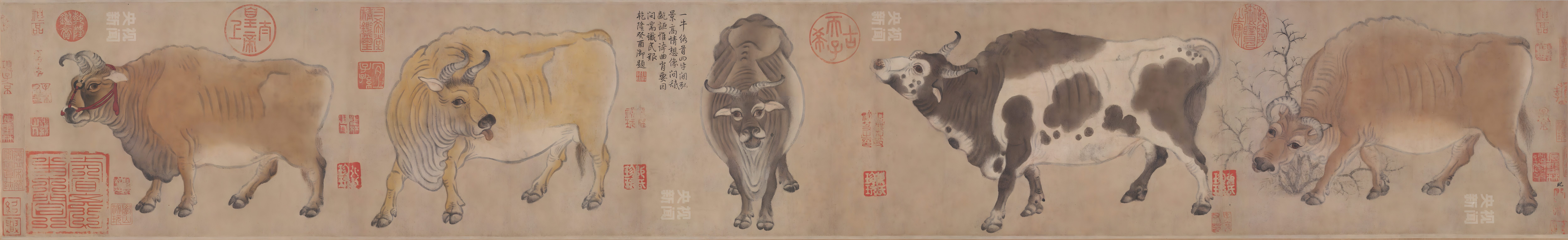 "Five Oxen" scroll, Tang Dynasty, by Han Huang, ink and color on paper, 20.8 cm high by 139.8 cm wide.