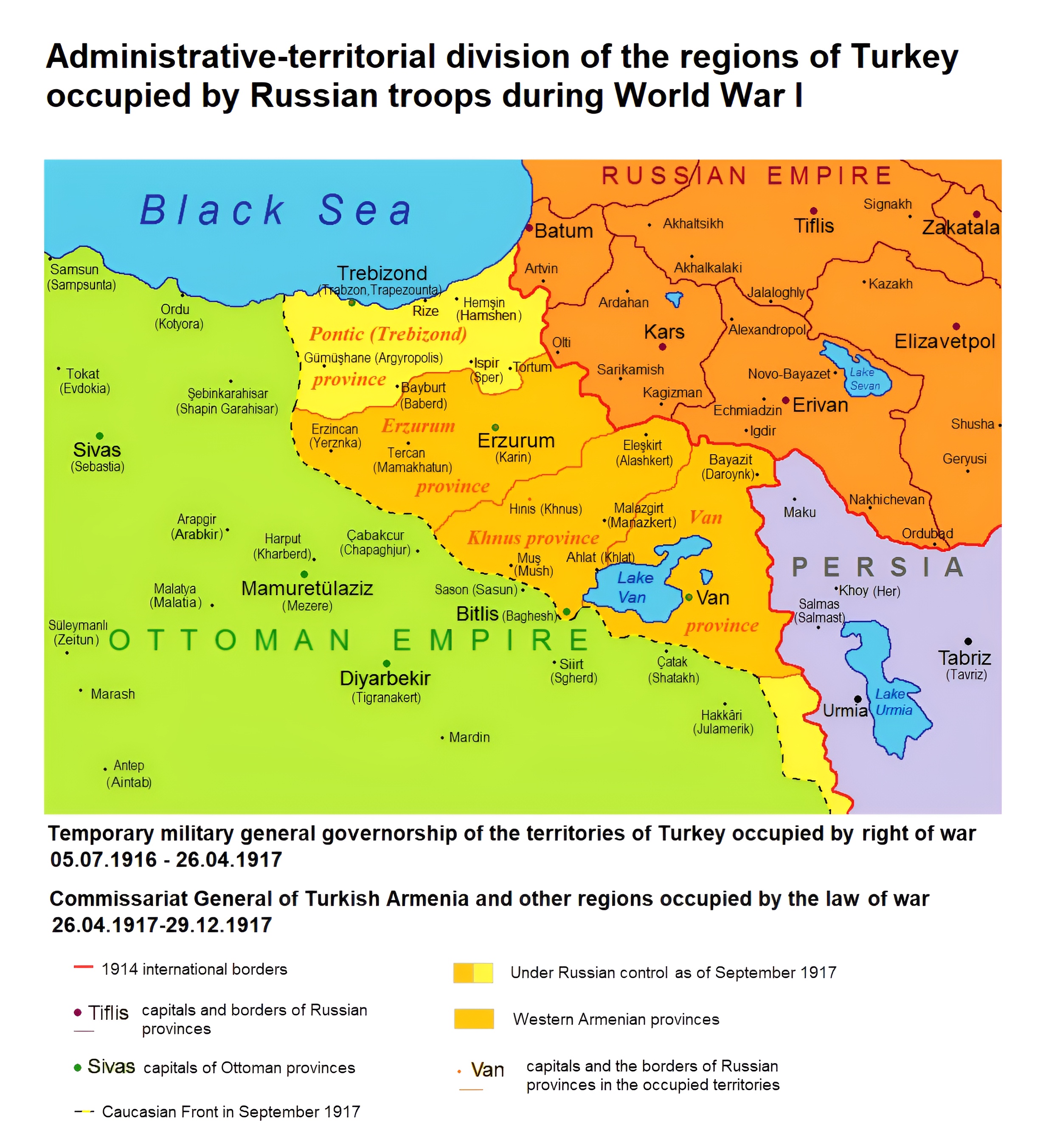 1차대전에 따른 동부 아나톨리아 지역 국경 양상. 터키 기준으로는 적지 않은 땅을 상실했다.