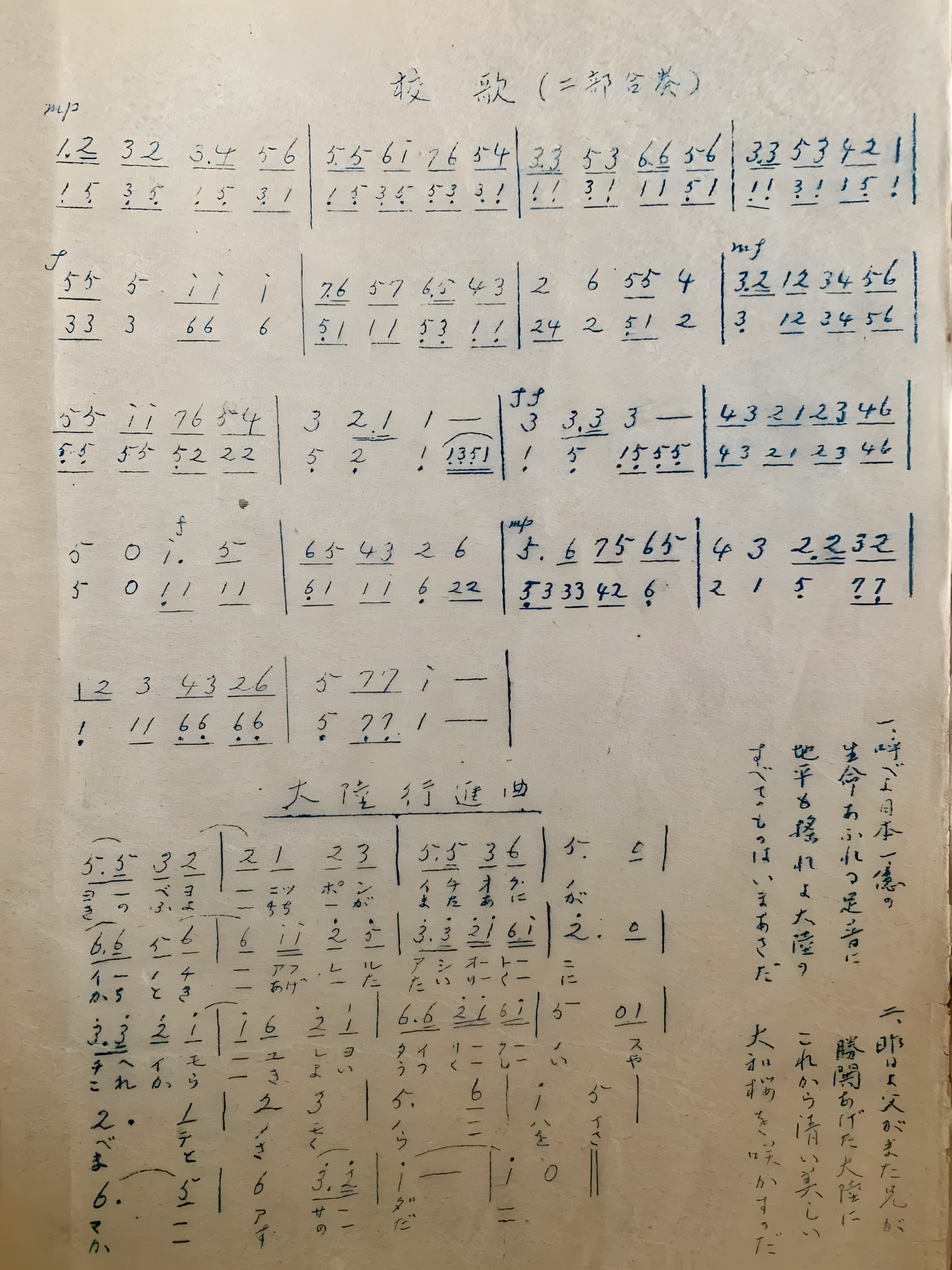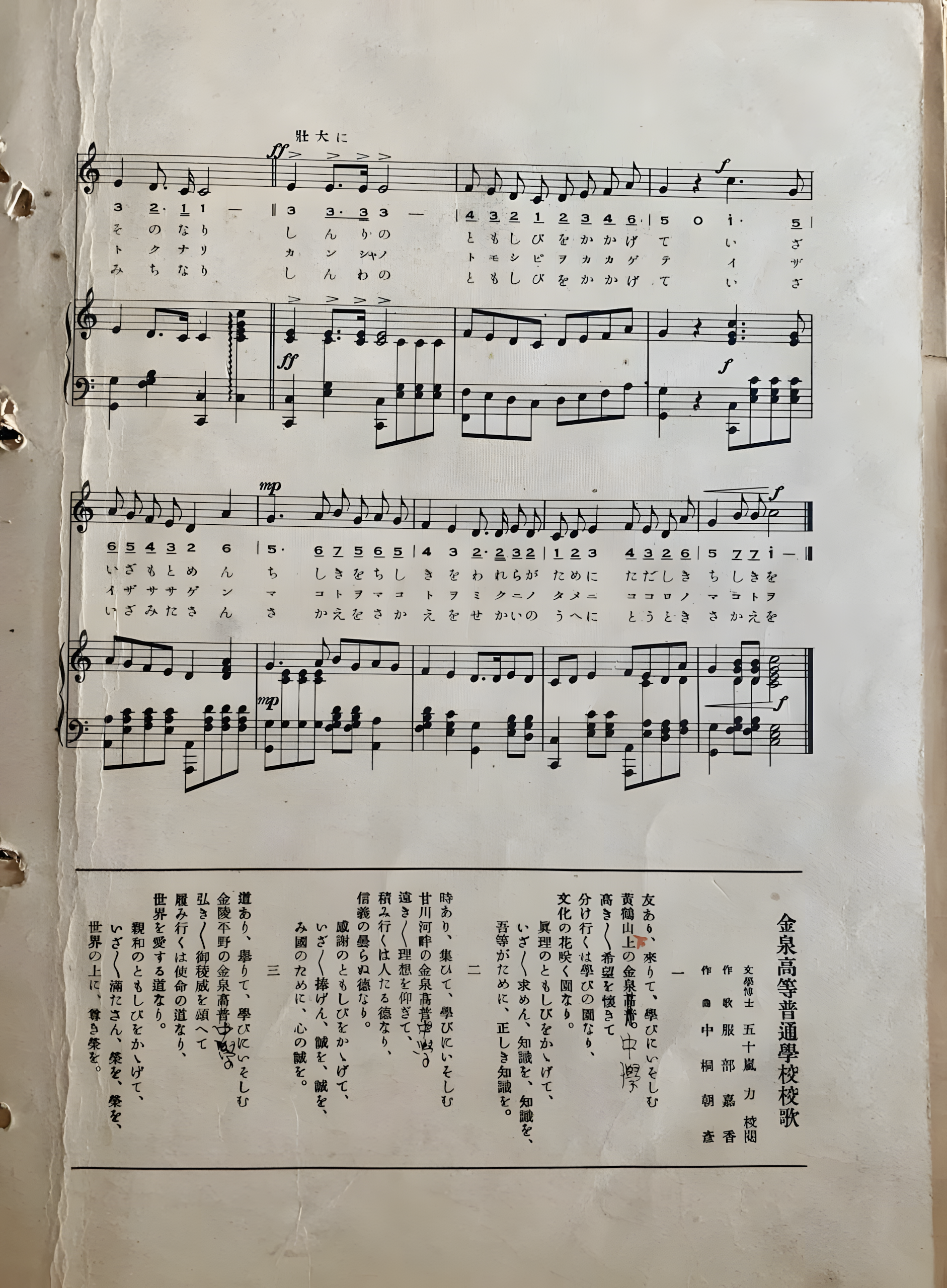이 교재에는 1937년(일본 황기 2597년. 소화 12년)에 제작된 김천고등보통학교(김천고보) 교가가 수록되어 있다.
