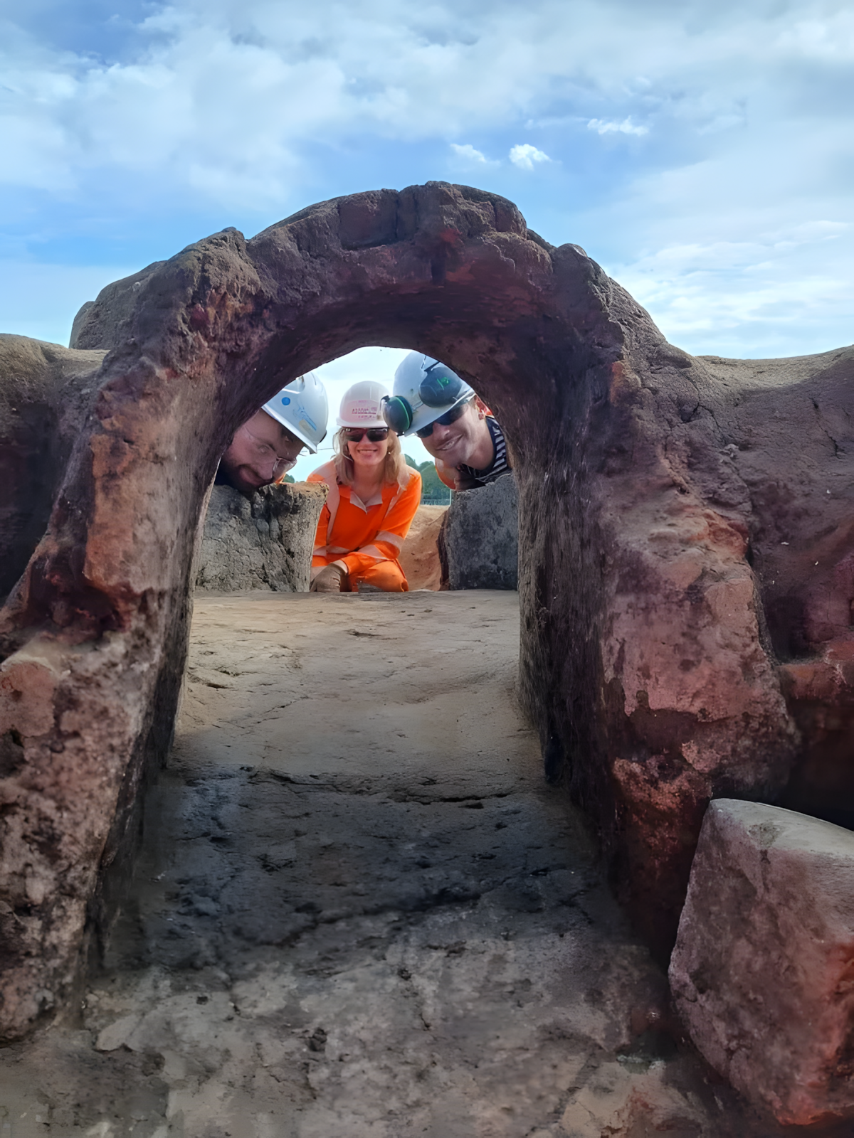 발굴팀이 로마 도자기 가마의 굴뚝을 들여다보고 있다 © 옥스퍼드 코츠월드 고고학 연구소