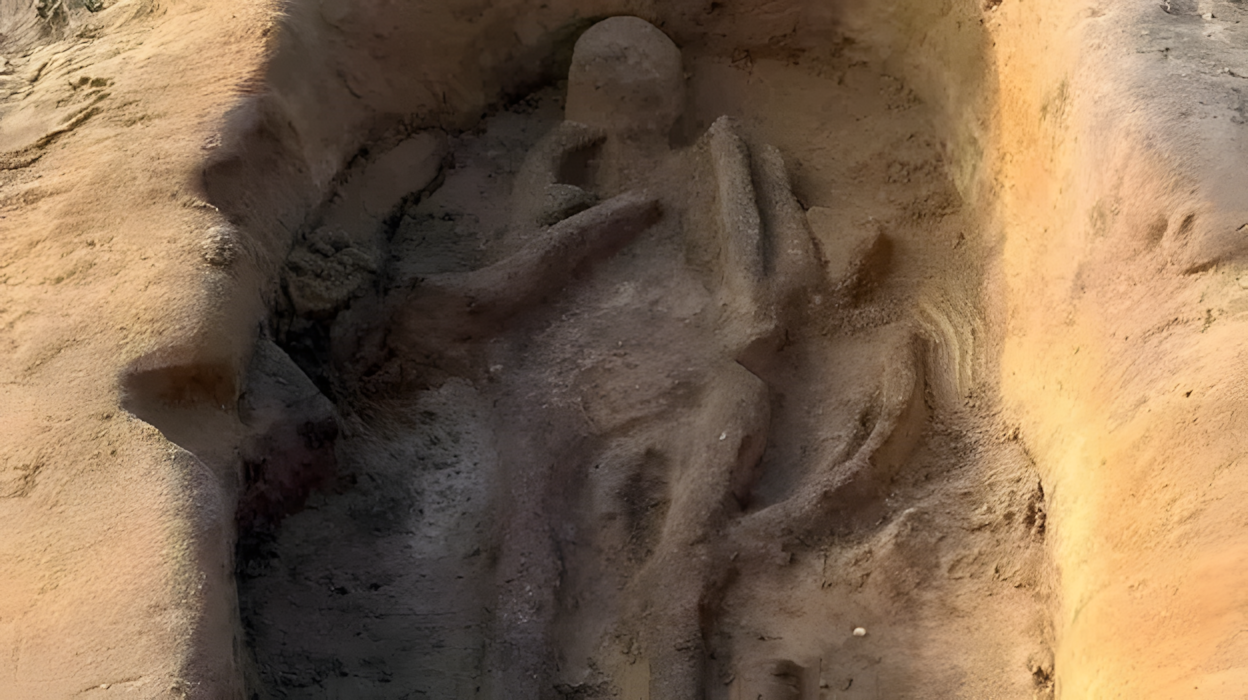 산성 토양이라 뼈와 살점이 녹아 '모래 실루엣'으로 변해버린다 ❘ 옥스퍼드 코츠월드 고고학Oxford Cotswold Archaeology. 약 1.4m(4피트 6인치) 높이 앵글로색슨 시대 조랑말 유해가 두 사람 그림자 해골과 함께 묻힌 채로 발견되었다.