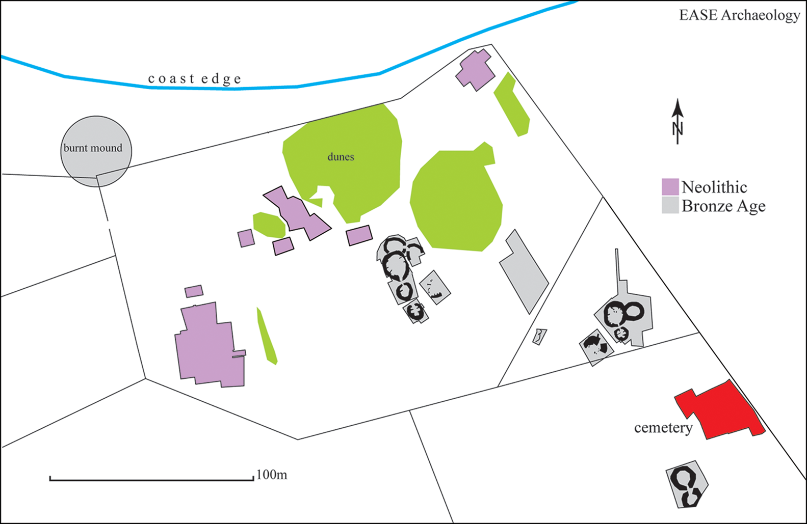 이러한 발굴 작업을 통해 여러 채 가옥과 기타 구조물, 그리고 공동묘지가 발견되었다.