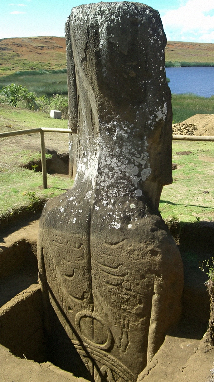 Petroglyphs, or rock art, are seen on the back of Moai 157, which was re-exposed during the excavation of two Moai by Jo Anne Van Tilburg and her team at Rano Raraku quarry, Rapa Nui.