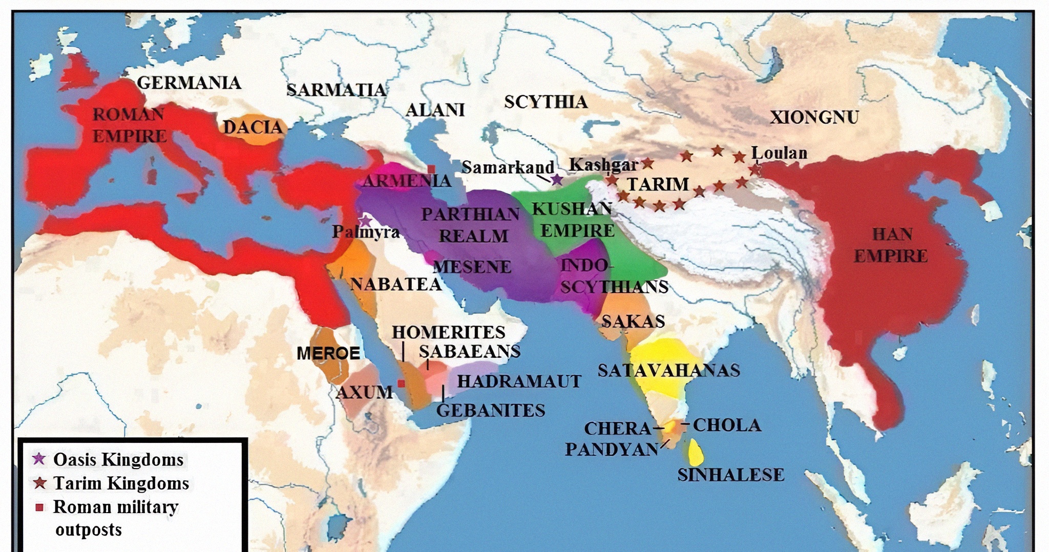 이 지도는 출처가 조금 요상한 점이 있지마는, 로마제국과 그 반대편 한漢제국이 공시 공존한 시절을 보여주는 지라, 땅덩어리로 보면 두 왕조는 거의 차이가 없다.