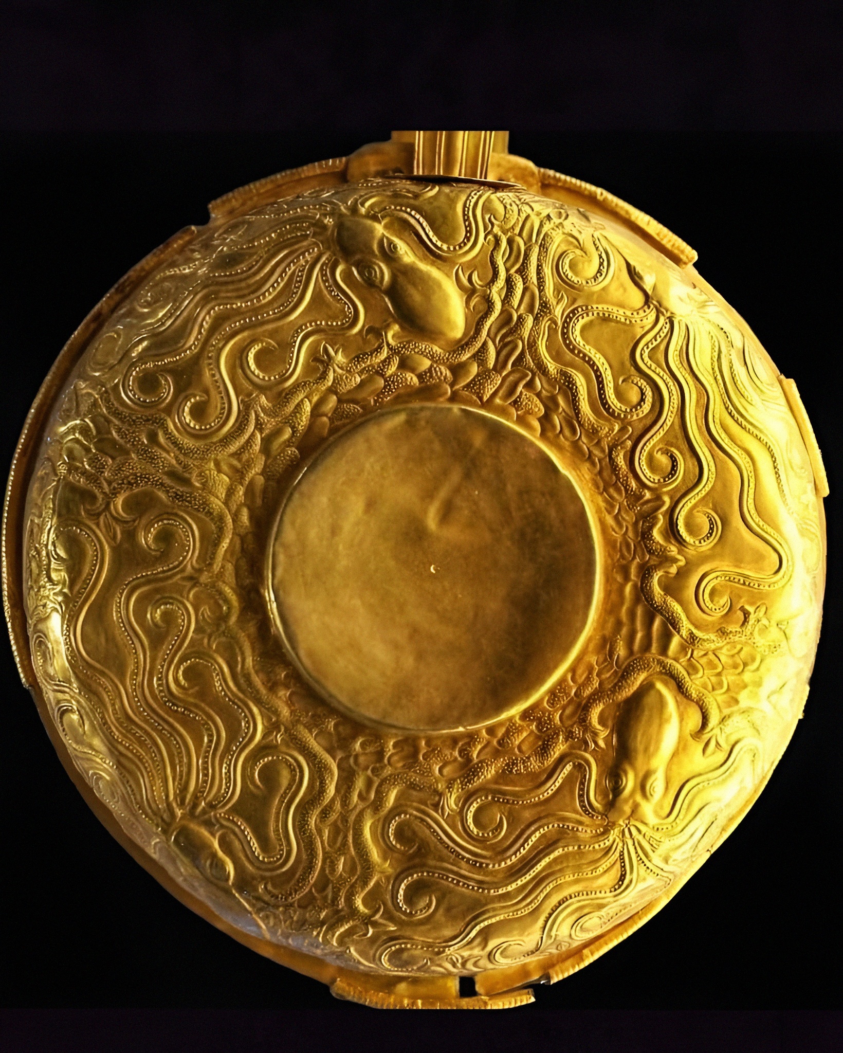 이 용기 제작자들은 내부 표면을 망치로 두드려 문어, 아르고노 argonauts, 돌고래, 바위와 산호가 전체 표면에 조화롭게 배열된 생생한 해저 장면을 완성했다.