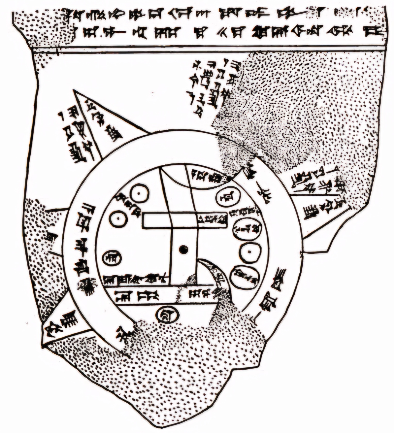 메소포타미아는 원형 "쓰라린 강 bitter river"이나 대양으로 둘러싸여 있으며, 7~8개 외국 지역은 아마도 산으로 상상되는 바다 너머 삼각형 섹션으로 묘사된다.