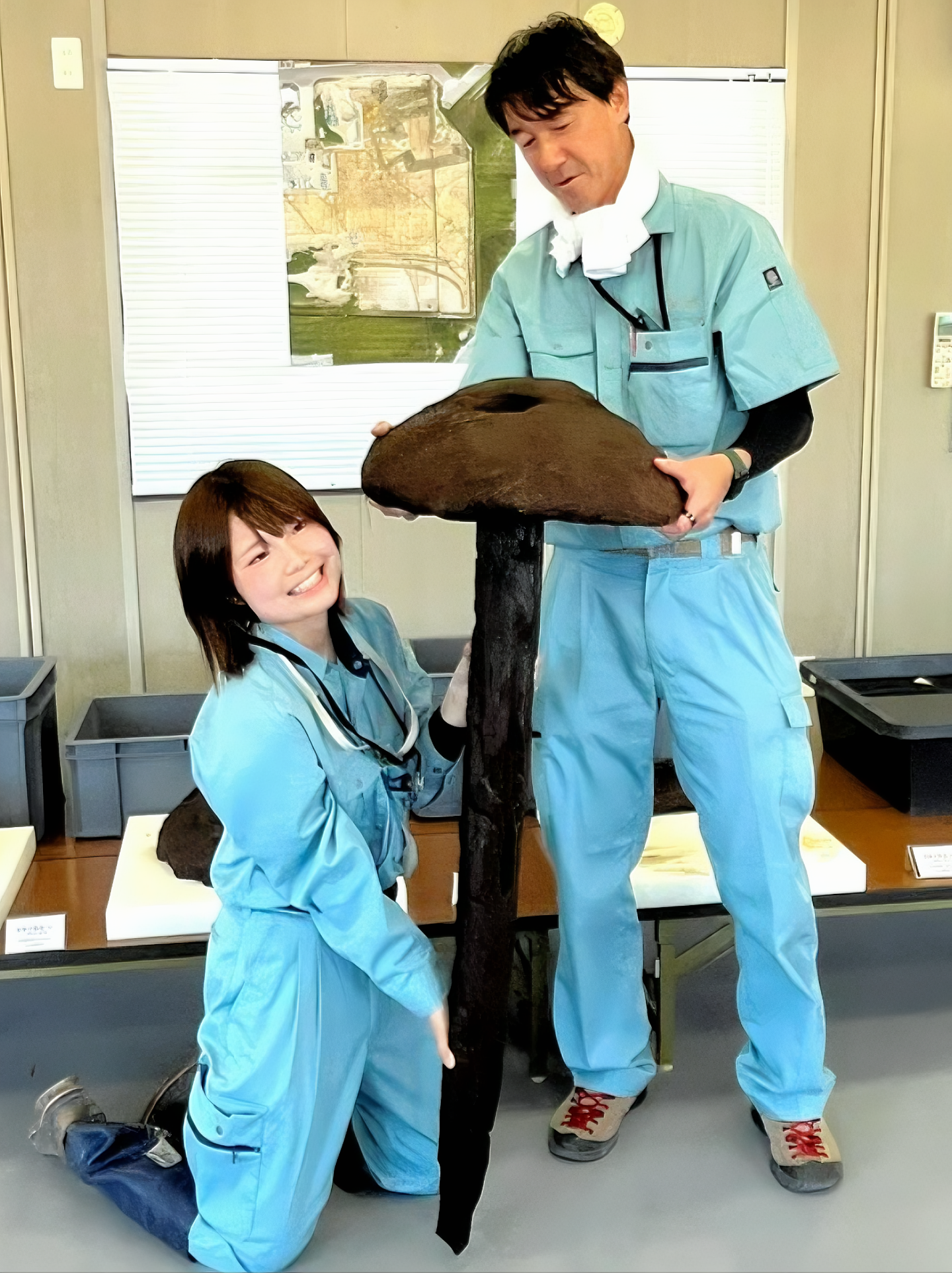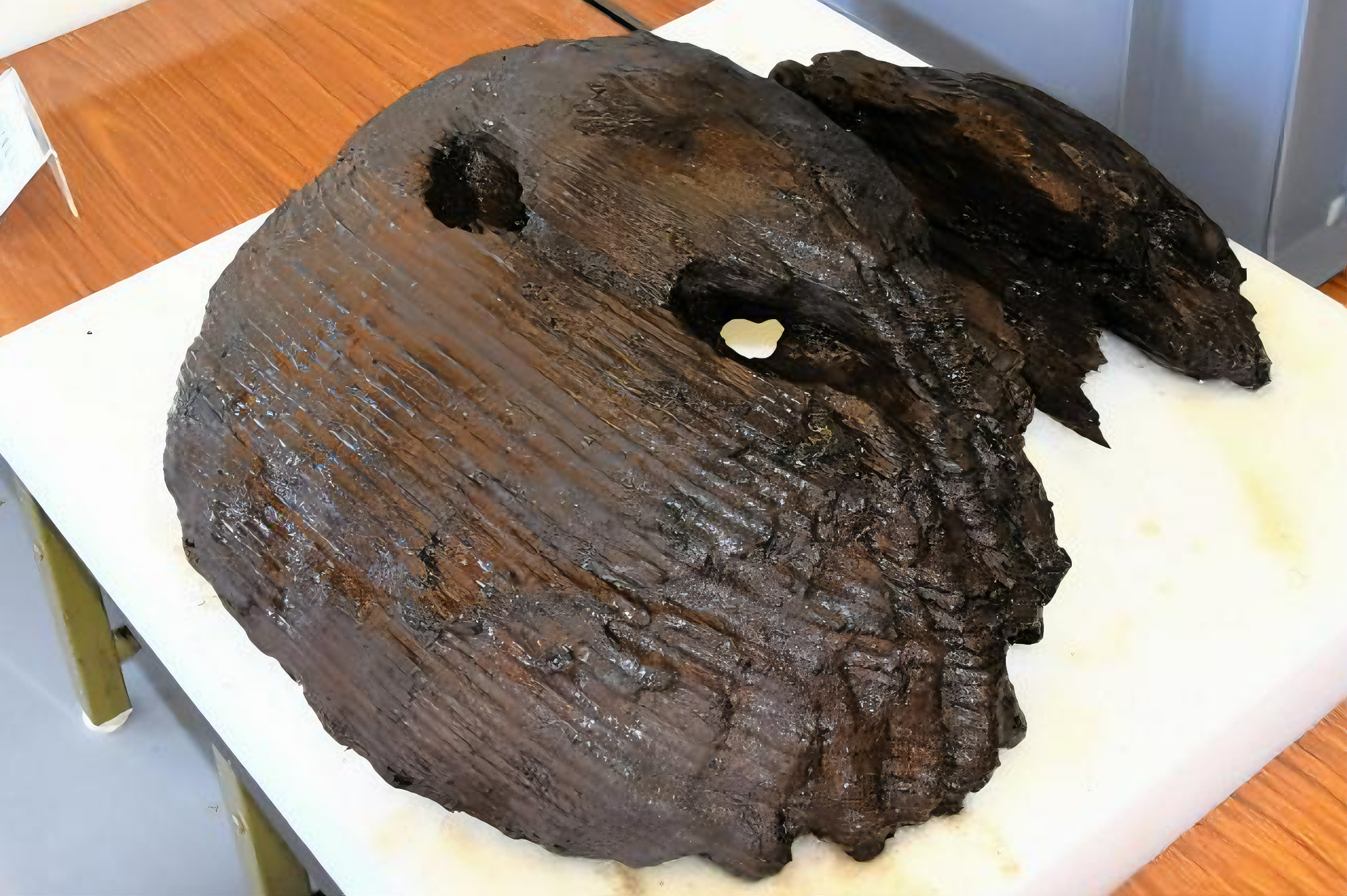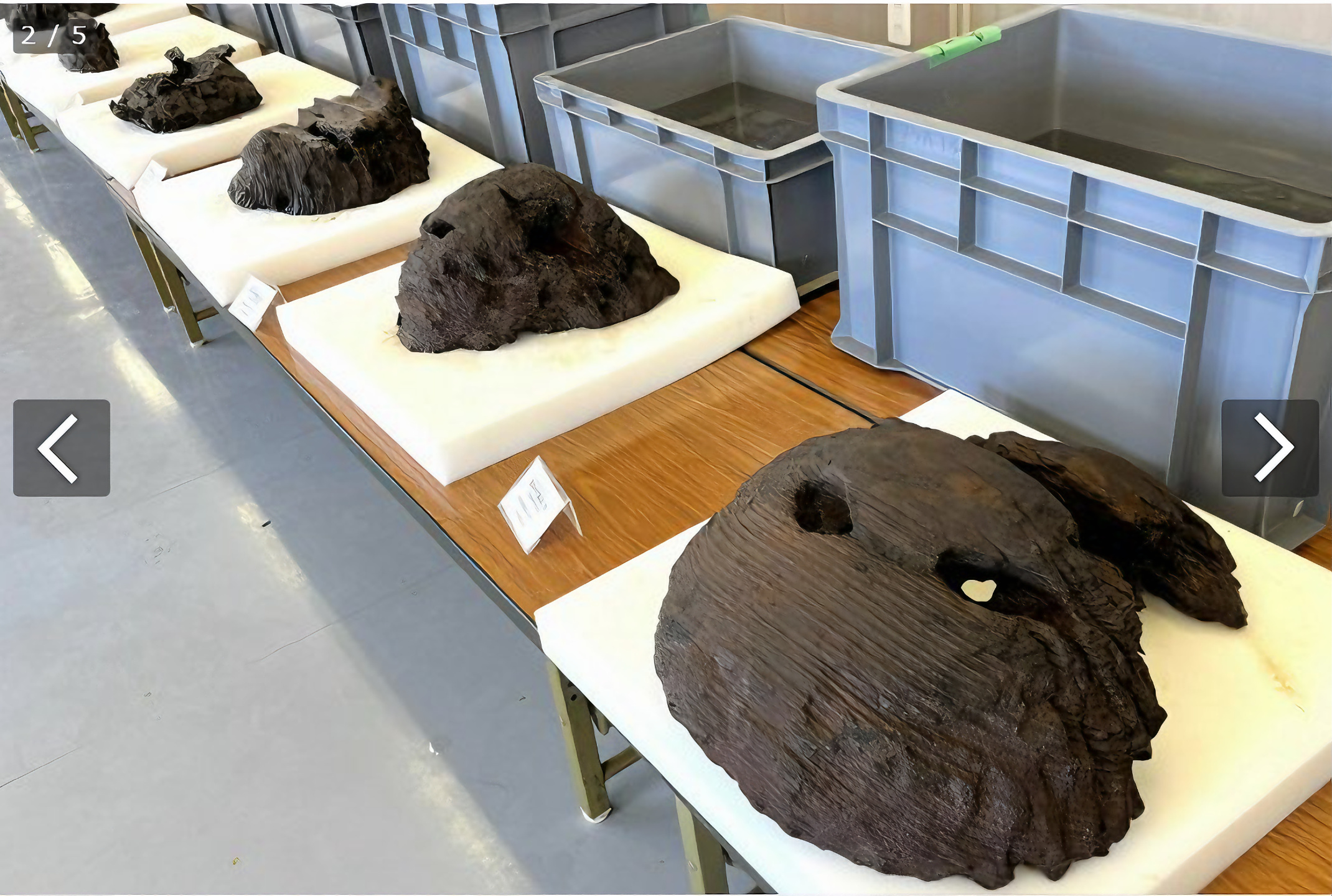 이 센터에 의하면, (이런 목제 유물이 여러 점인지) 큰 것은 긴쪽 지름 47·5센티미터, 짦은 거리 지름 44센치 반구형이라고.