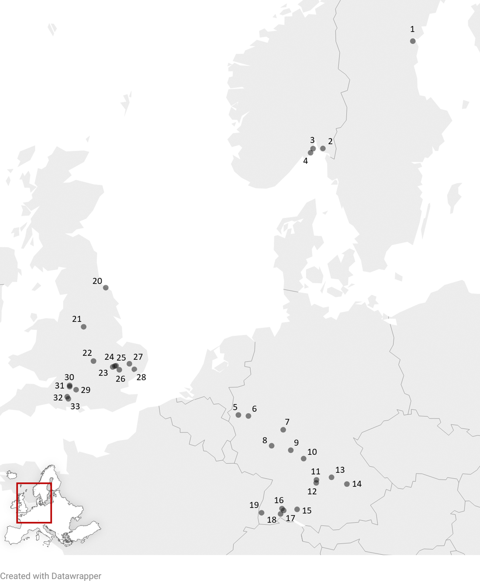 침상 매장bed burials 유럽 분포. 1. Högom; 2. Rolvsøy; 3. Oseberg; 4. Gokstad; 5. Rödingen; 6. Cologne cathedral; 7. Leihgestern; 8. Eltville; 9. Wenigumstadt; 10. Tauberbischofsheim-Dittigheim; 11. Pfahlheim-Rennweg; 12. Lauchheim-Mittelhofen; 13. Weißenburg St Martin Pfarrkirche; 14. Pförring; 15. Mengen; 16. Trossingen; 17. Oberflacht; 18. Neudingen; 19. Biengen im Breisgau; 20. Streethouse, Loftus; 21. Lapwing Hill, Brushfield; 22. Harpole; 23. Edix Hill; 24. Trumpington; 25. War Ditches, Cherry Hinton, Cambridge; 26. Shudy Camps; 27. Ixworth; 28. Coddenham; 29. Collingbourne Ducis; 30. Roundway Down; 31. Winklebury Hill; 32. Swallowcliffe Down; 33. Woodyates, Pentridge.