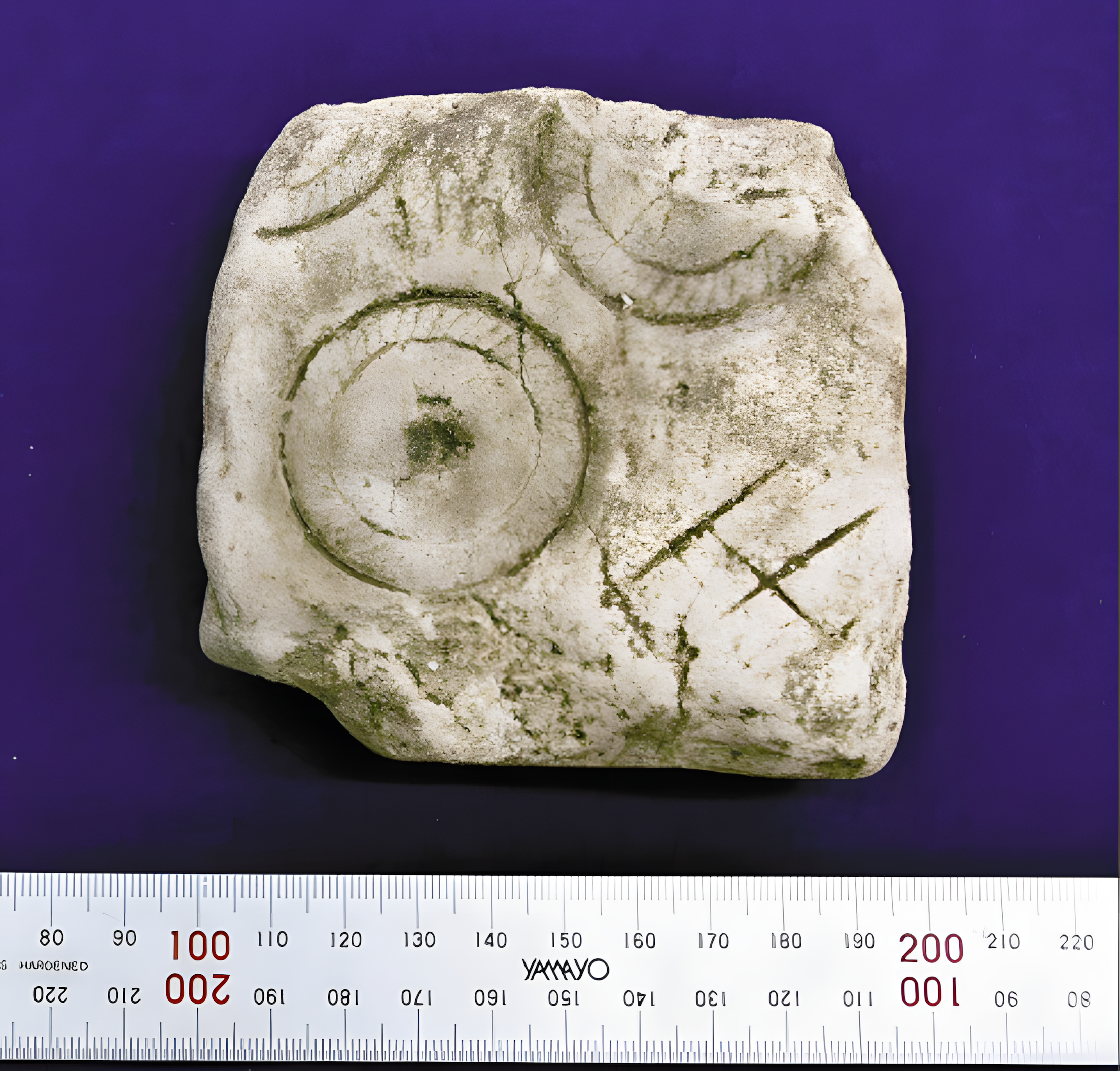 약 9㎝ 사방, 두께 약 4㎝ 판상板状으로 가장자리 안쪽에 촘촘한 사선을 그은 지름 4㎝ 정도 거울 틀이 세 점(두 점은 부분) 새겨 있다.