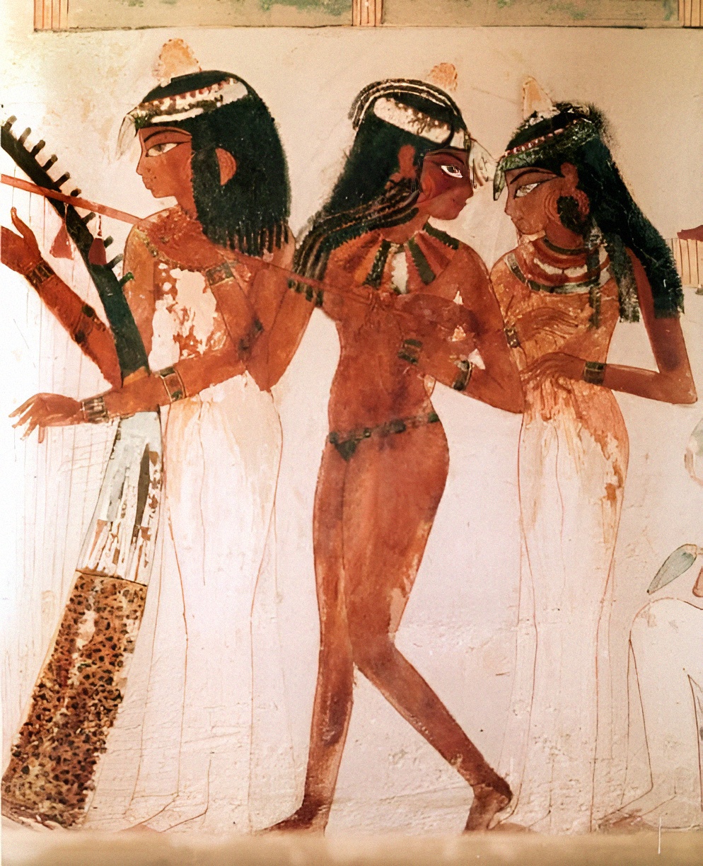고대 이집트 세 여성 음악가를 묘사한 나흐트 Nakht 무덤 그림 세부.
