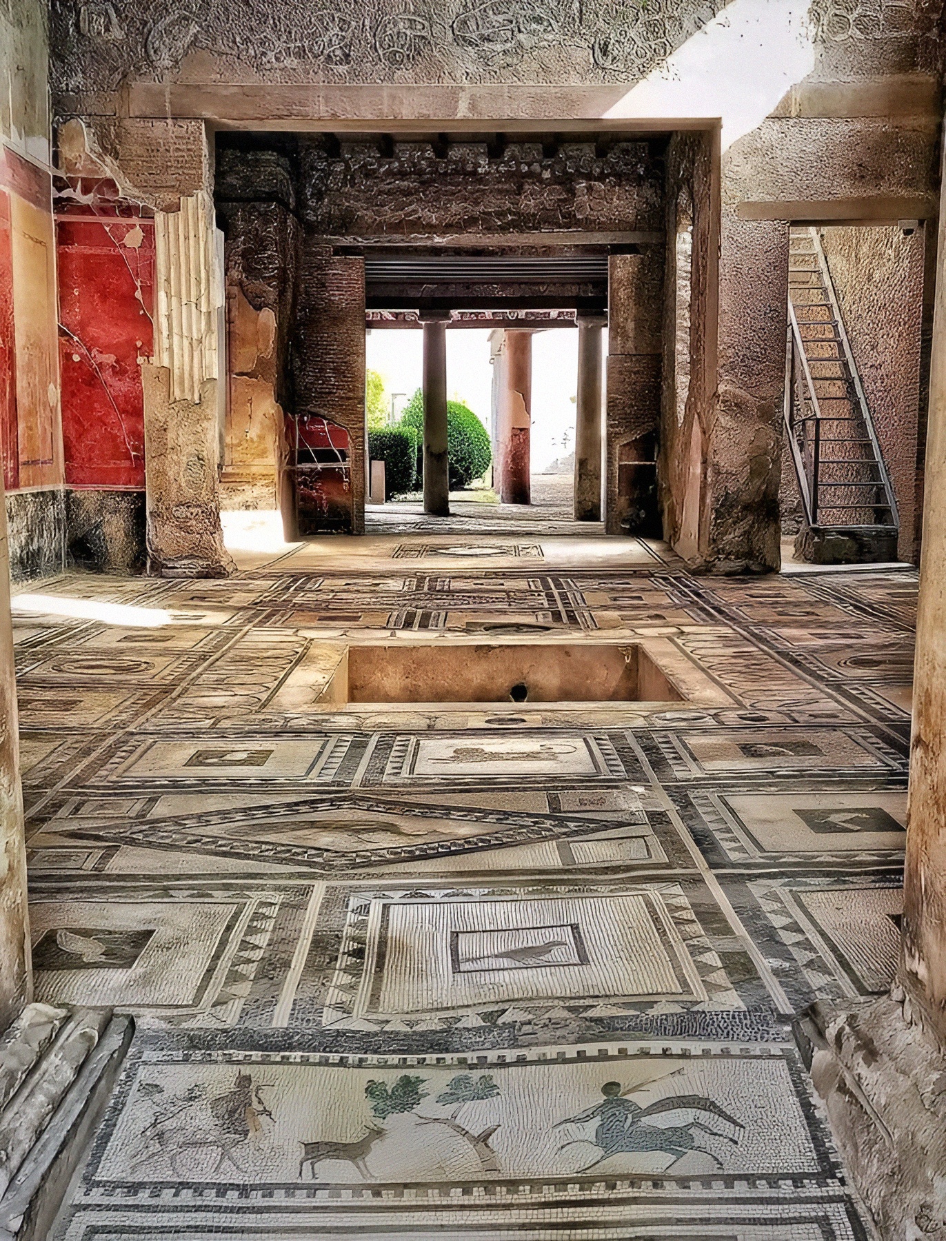페리스틸리움 peristylium 쪽으로 열린 주거 지역 장식도 고품질이다. 바닥은 귀중한 대리석과 세련된 비유 모자이크로 장식했으며 지지대에 작은 다색 타일을 모자이크 바닥 중앙에 배치했다. 트리클리니움 triclinium 모자이크는 도시에서 활동하는 유명 스튜디오가 제작한 여섯 피그미족 낚시 장면을 코믹하게 묘사한다. 나폴리 국립고고학박물관에 분리 보존된 또 다른 그림은 술에 취한 실레노스 Silenus 무게에 당나귀가 쓰러지는 장면이다.