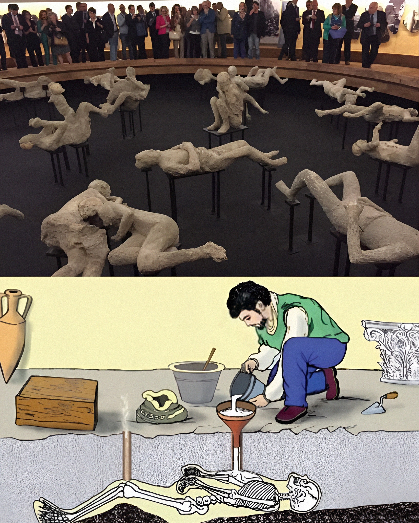바로 이 점을 이용해 사람이 있던 자리에다가 발굴조사자들이 석고를 쏟아부어 버리면 그 빈 속만 꽉 차게 된다.