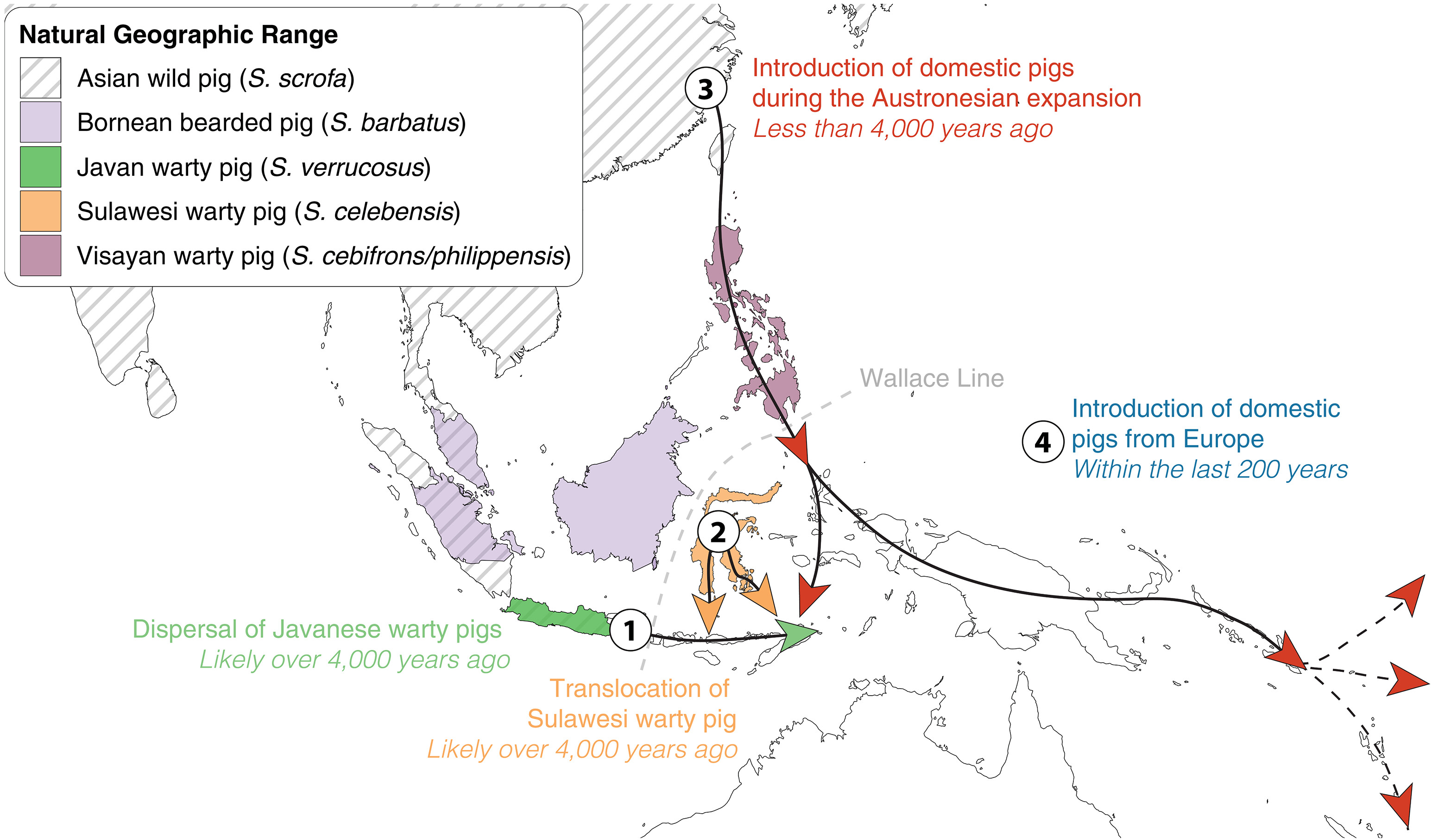 동남아시아 섬 지역에 돼지가 유입되기 시작한 것은 약 4,000년 전, 초기 농경 사회가 가축 돼지를 들여오면서 급격히 가속화했다.