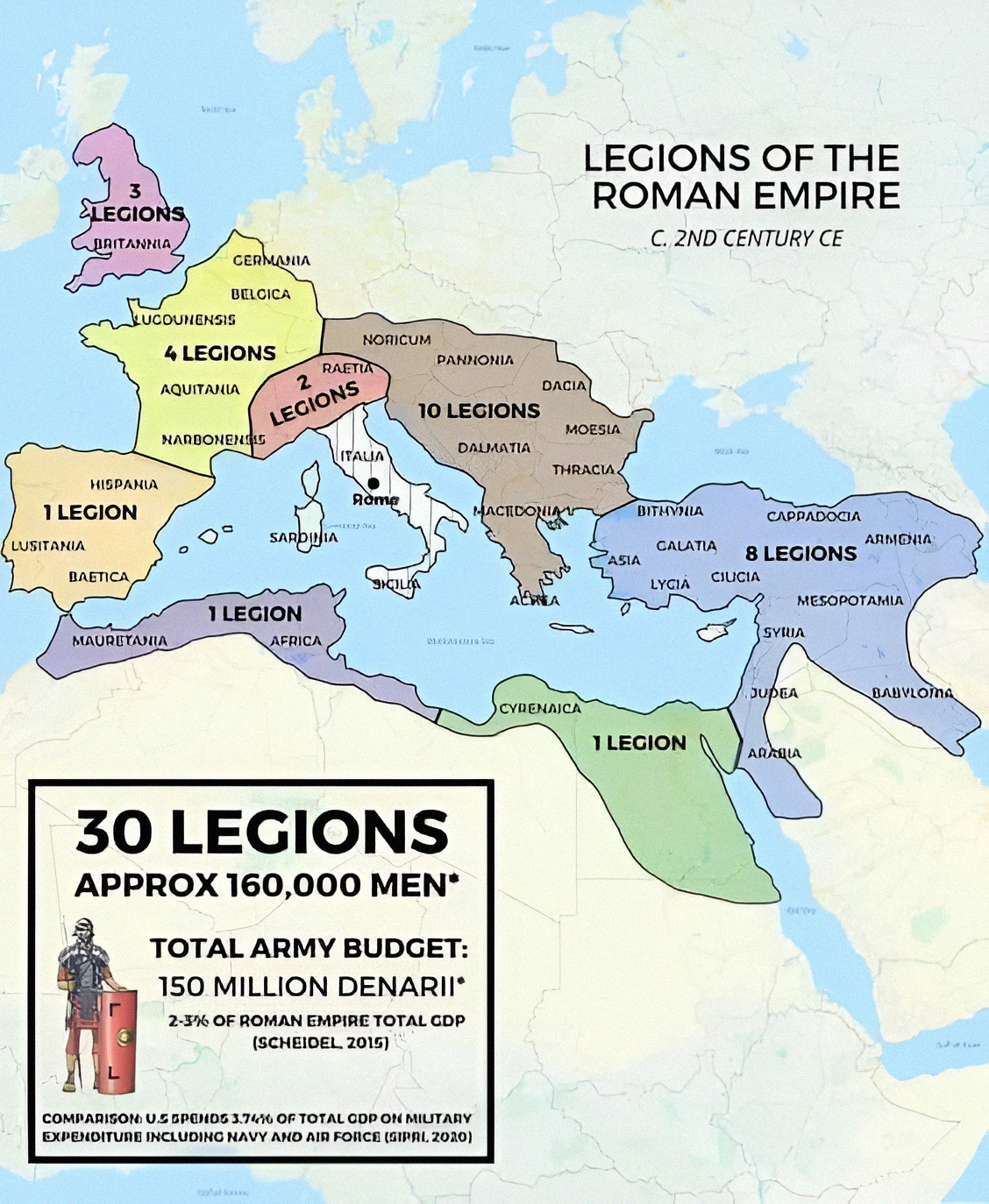 앞 지도가 서기 212년 군단 편제라는데, 제국 전체에 걸쳐 28개 군단이 있었고, 그 집중 포진하는 지점이 모조리 로마 변경임을 주시해야 한다.