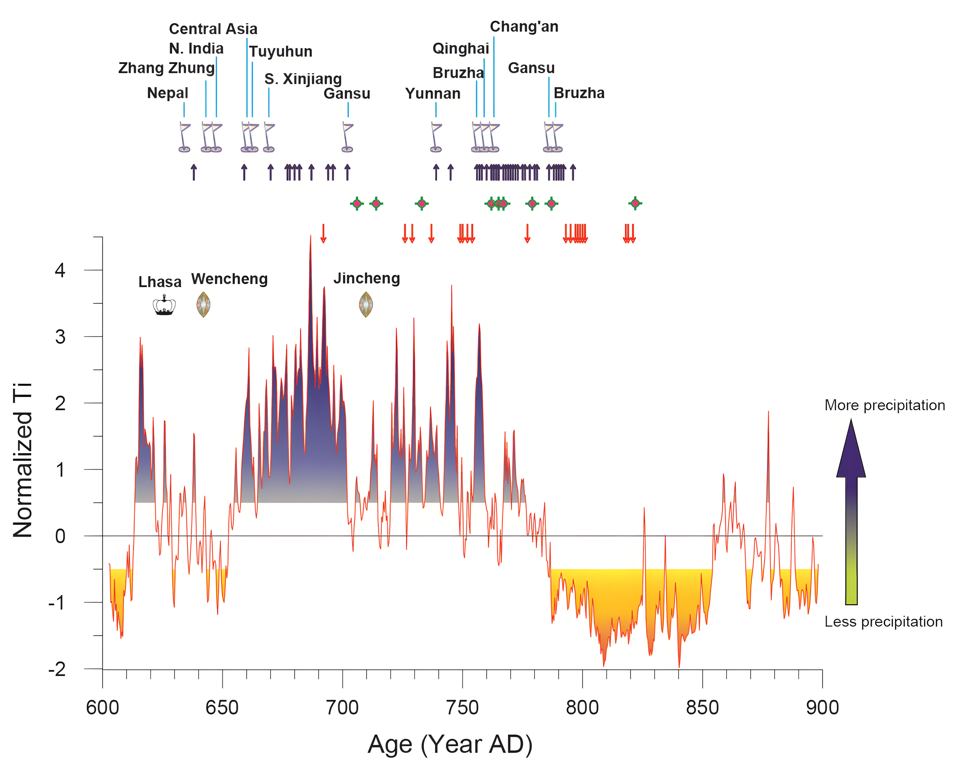 따뜻하고 습한 기후와 춥고 건조한 기후의 변화는 티베트 제국의 외교 정책 변화와 높은 상관관계를 보였다.