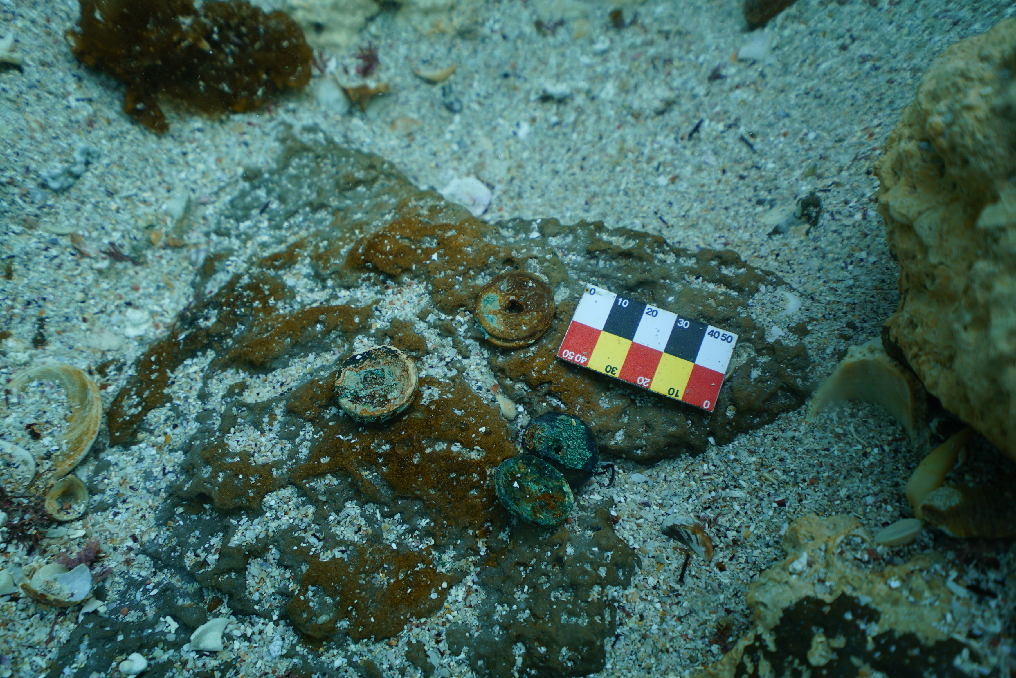 今回の発掘調査では、碇石と一緒に、中国銅錢も確認された。発見された銅錢は景德元寶(1004〜1007年の鋳造)、熙寧元寶(1068〜1077年)、宣和通寶(1119〜1125年)の両方北宋時代に作られたものである。この銅錢の中景德元寶は高麗時代、済州島の代表的な寺院である水精寺からの中国の磁器と一緒に発見された事例があり、熙寧元寶は済州高內里遺跡で発見された事例がある。このように、済州島内の陸上と海の中で同じ種類の遺物が確認されるということは、過去の海路を通じた東アジアの国際交流で済州島の位置を見計らって見ることができる事例とすることができる。