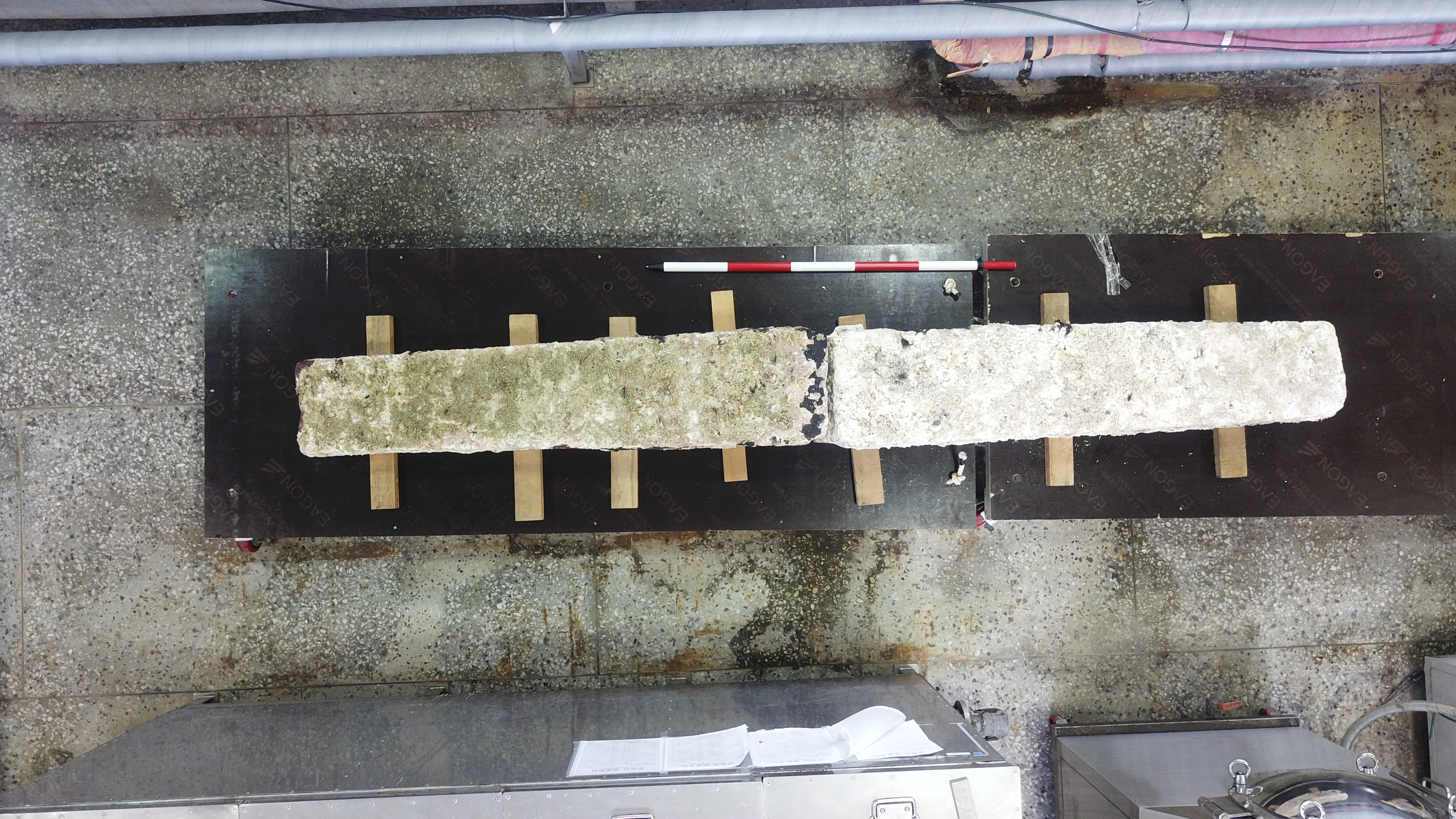今回発掘された碇石は二つに分割さ発見され、全体的に長い菱形で中央部が肉厚で両端に行くほど細くなる形状である。すべての面を平らに整えたが、自然石の一部だけを整えて使用した韓国の伝統的な碇石とは異なる。碇石中央部には、22cmの浅い溝が加工されており、固定釘をインストールするための幅7cmほどのホームも確認される。