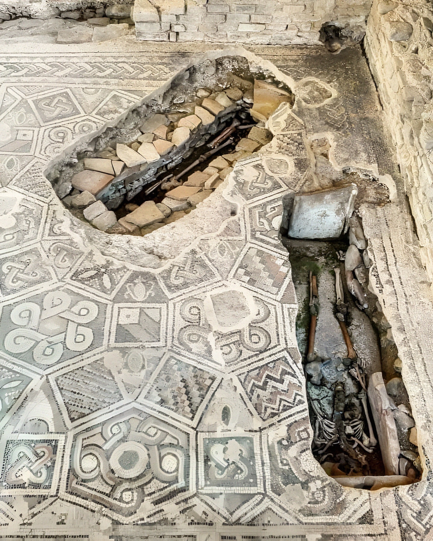 하지만 궁전이 폐기하면서 서기 6세기에 들어서는 매장지로 사용되었으며 그 중 일부는 그 과정에서 사진에서 보듯이 모자이크 바닥을 파고했다.