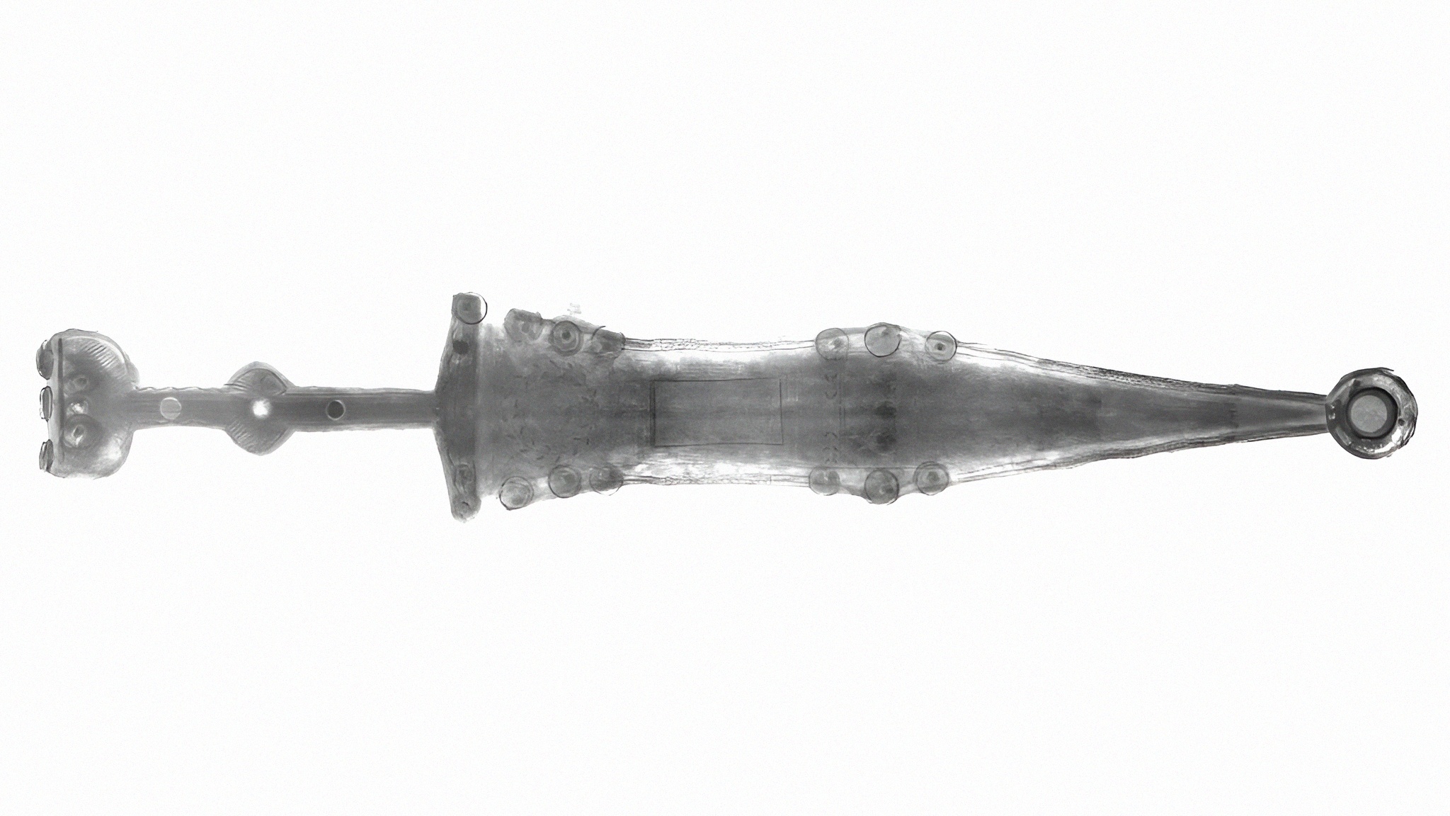 저 녹슨 덩이가 심상치 않음을 직감한 발굴단과 보존과학자들은 관련 사진을 보면 녹덩이가 나온 지점 토층 전체를 완전히 잘라서 그 전체를 연구소로 옮기고는 우선 X-레이와 CT 스캔을 했다.