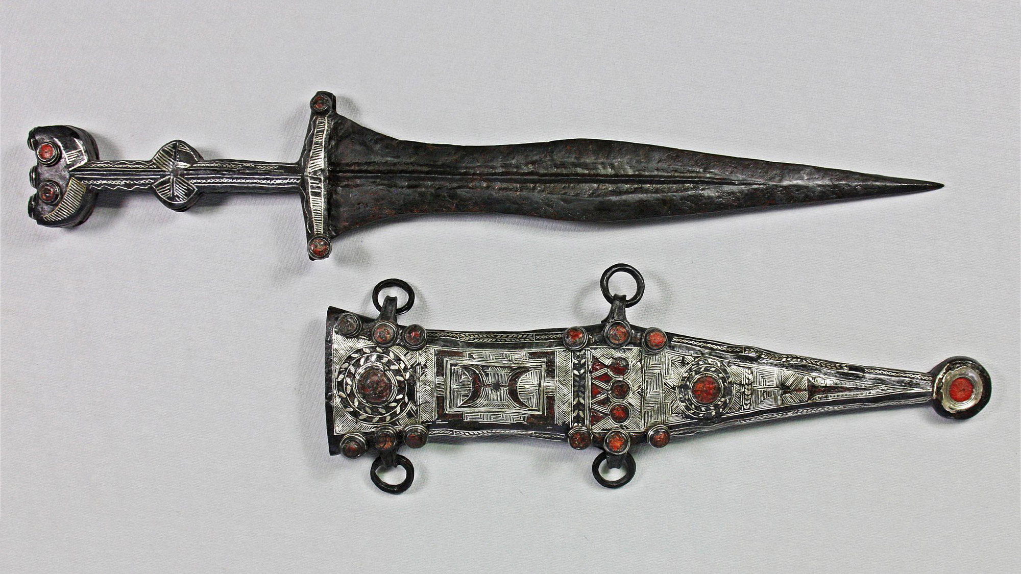 길이 35㎝인 그 칼은 손잡이가 은으로 상감하고 리벳으로 장식했으며, 철제 몸날 iron blade 은 그 중간 midrib 쯤 양쪽에 깊은 홈 grooves 이 있고 돌출한 허리와 길게 가늘어지는 끝이 특징이었다.