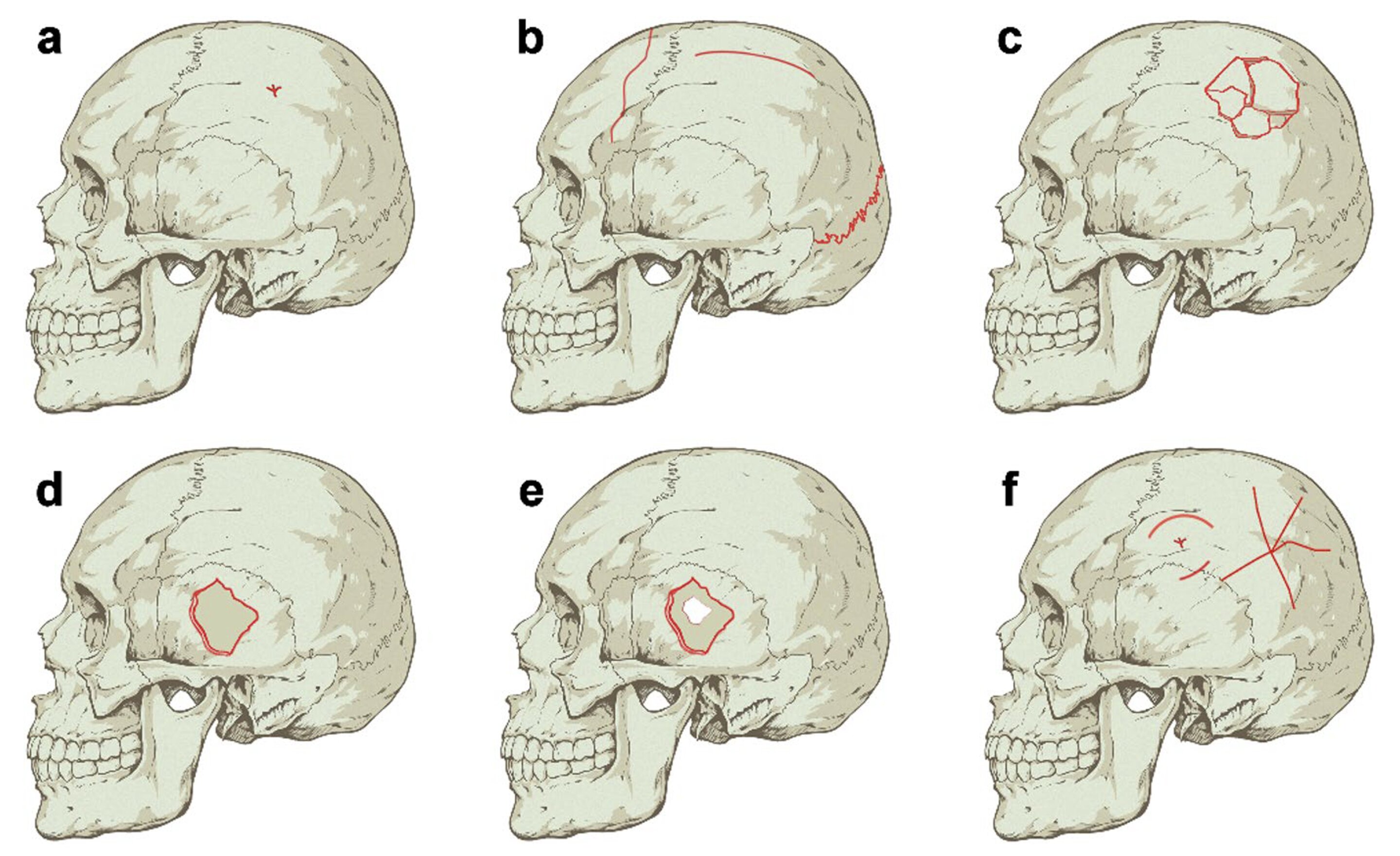 집중된 충격은 뼈가 안쪽으로 변위되는 함몰 골절depressed fractures을 유발하는 경향이 있으며, 이는 일반적으로 폭력적인 사건과 관련이 있다.