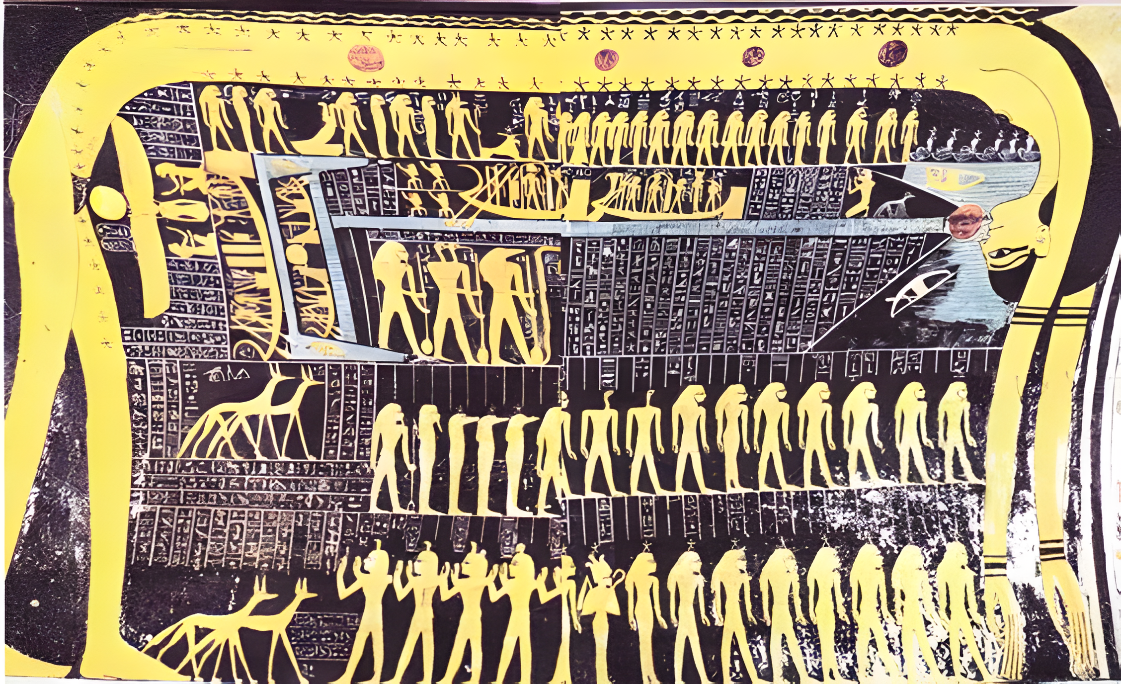 람세스 6세 무덤에 있는 인간을 감싼 하늘의 여신 누트와 그 안에 포진한 인간들 형상.