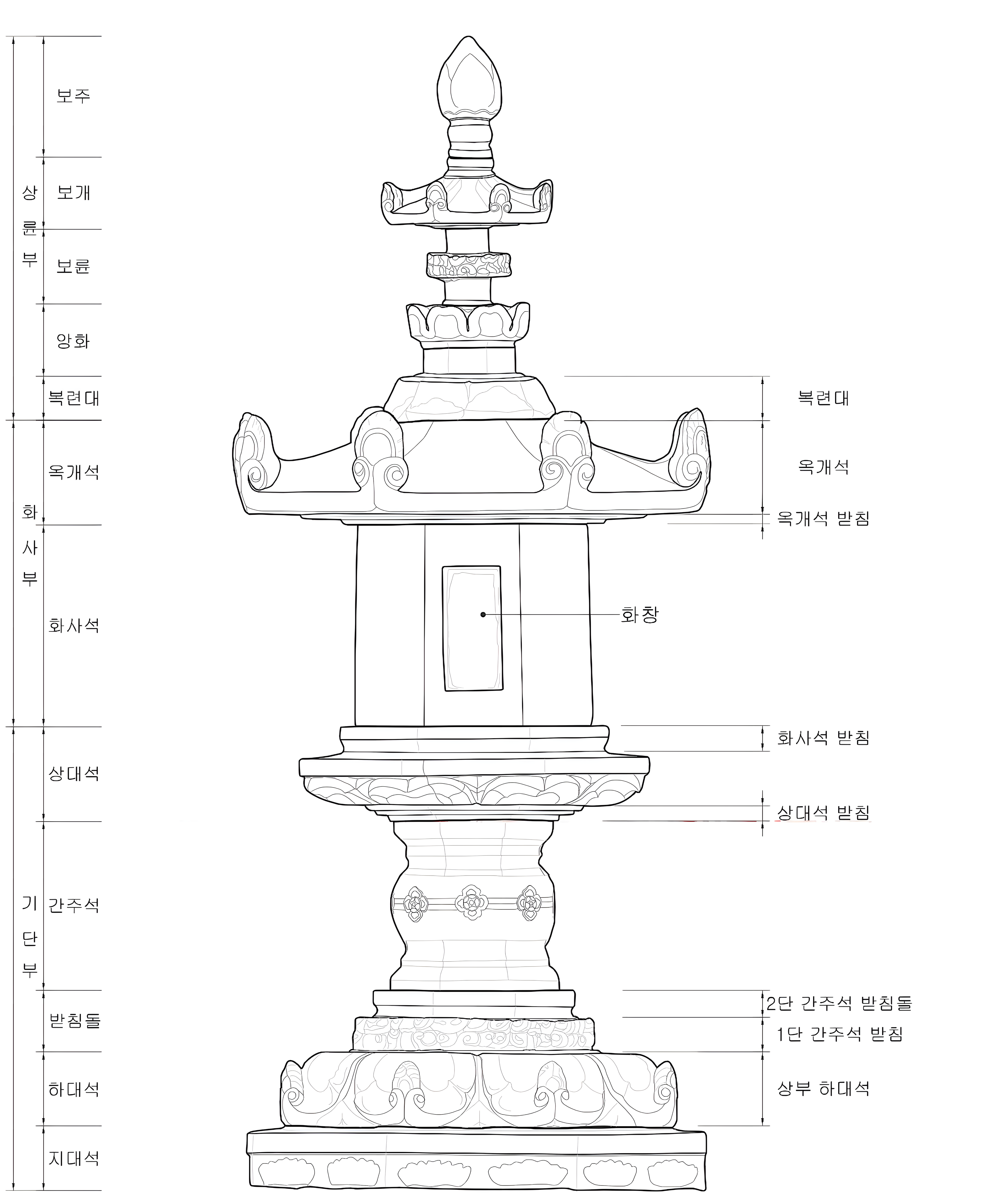 간주석은 竿柱石이라 쓰는데, 竿이 대롱 혹은 장대라는 뜻이니 저 석등을 장대로 보아 저리 쓴 듯하고, 상대석이라 표시한 지점은 실은 전체 받침하는 시설 옥개석, 곧 지붕에 해당한다.