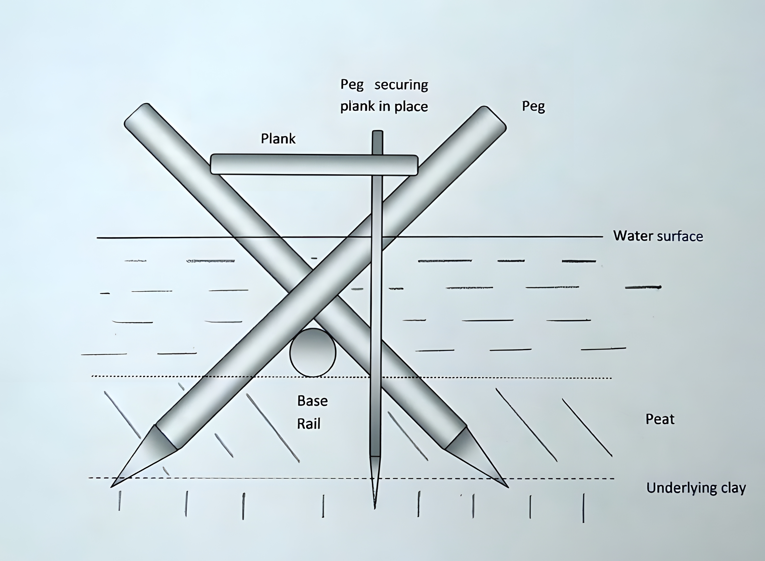 섶 brushwood, 통나무 logs, 점토 clay 를 기초로 만든 나무 판자들 wooden planks 을 깔아 건설한