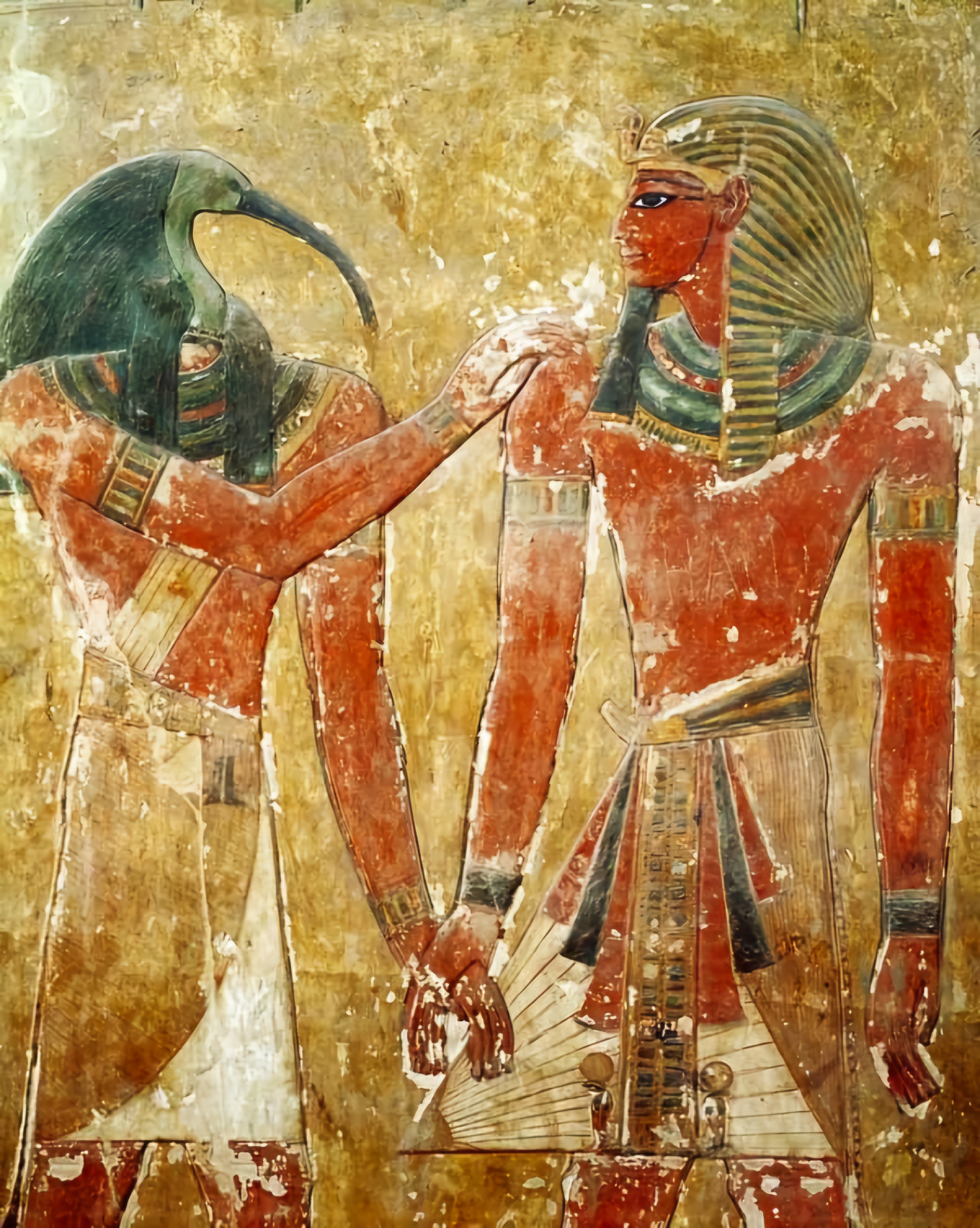 오른쪽이 파라오, 그가 손을 잡은 맞은편 닭대가리가 토트 Thoth 라는 남성신이라 한다.