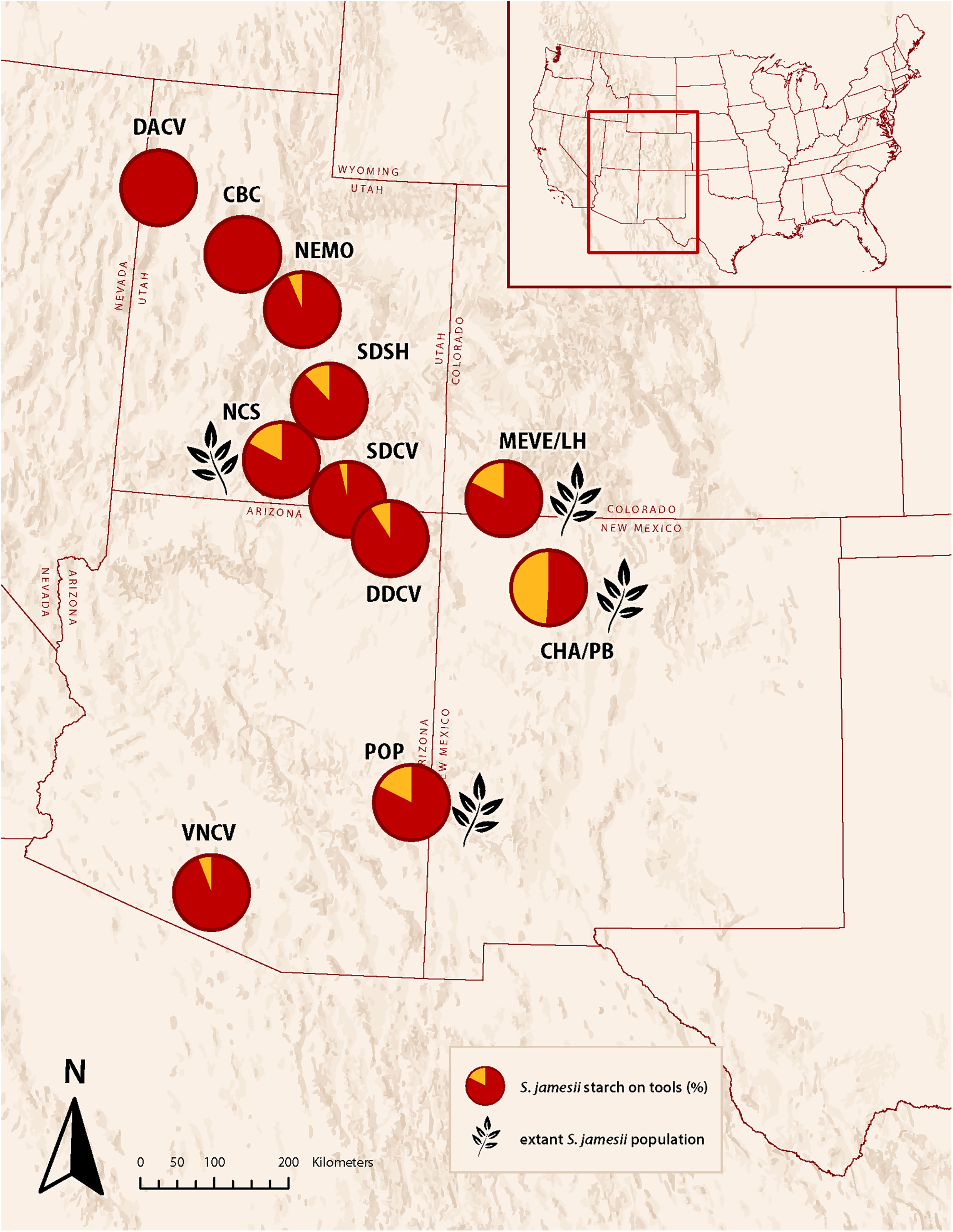 S. jamesii 녹말 알갱이 비율이 가장 높은 도구들은 유타주 남부(노스 크릭 셸터North Creek Shelter), 콜로라도주 남서부(롱 하우스Long House, 메사 베르데Mesa Verde), 뉴멕시코주 북서부(푸에블로 보니토Pueblo Bonito, 차코 캐니언Chaco Canyon)의 포 코너스 지역에서 출토되었다.