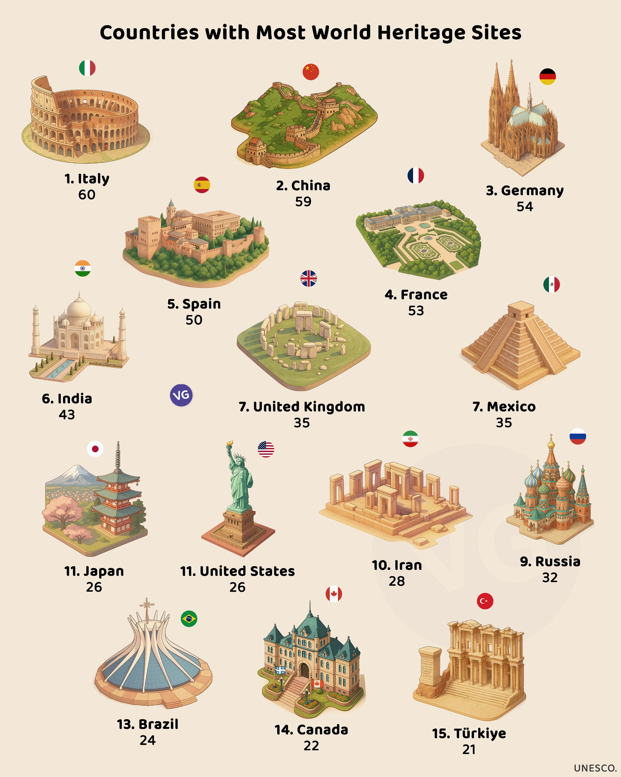 유럽 독주에 중국이 맹추격하는 국가별 세계유산 보유숫자