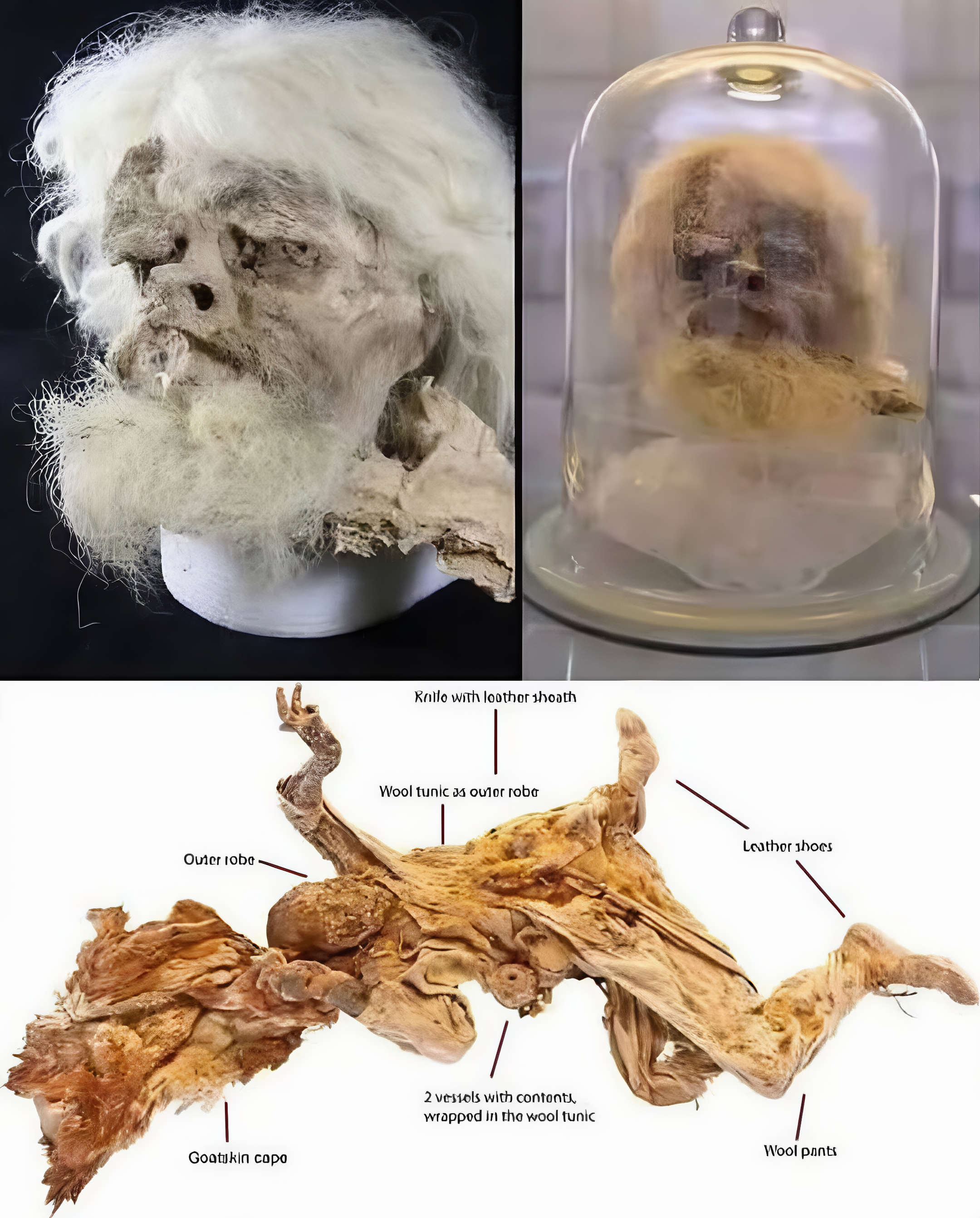 This ancient mummy, later named the “Salt Man,” was found surrounded by items such as a leather boot, iron knives, woolen trousers, and a silver needle.