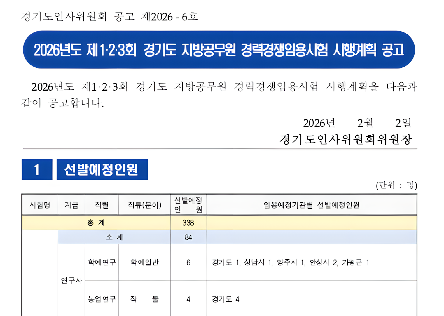 2026년도 제1·2·3회 경기도 지방공무원 경력경쟁임용시험 시행계획 공고 | 시험공고 | 경력 경쟁임용 | 공무원 임용시험 | 뉴스 | 경기도청 2026년도 제1·2·3회 경기도 지방공무원 경력경쟁임용시험 시행계획 공고