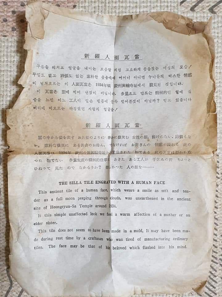 언제인지는 모르겠지만 아마 경주시청과 경주경찰서에서 방문자들에게 선사할 기념품조로 선생께 두 작품을 대량으로 주문한 모양이다. '신라의 미소' 쪽 끈이 삭아 떨어진 걸 보나, 같이 남은 해설문 글투를 보나 연대가 그래도 꽤 올라감직 하다.