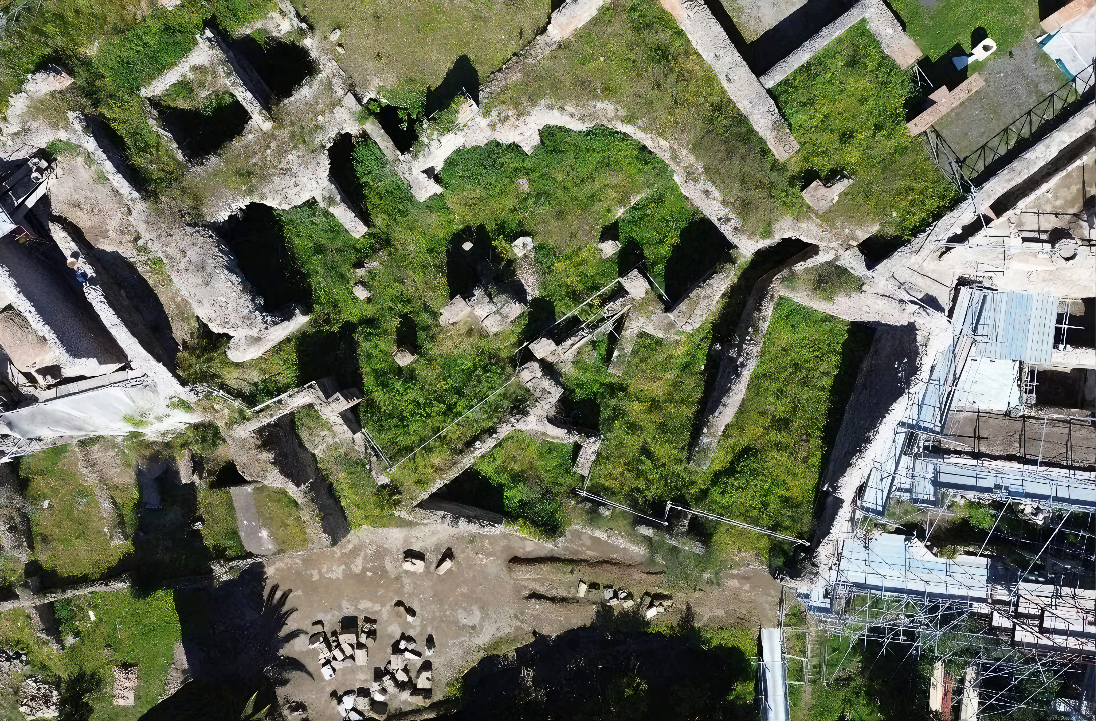 이 흔적들은 빌라 임페리알레Villa Imperiale에서 콰드리포르티코 데이 테아트로Quadriportico dei Teatri까지 이어지는 도시 남부 지역인 인술라 메리디오날리스Insula Meridionalis에서 최근 발굴됐다.