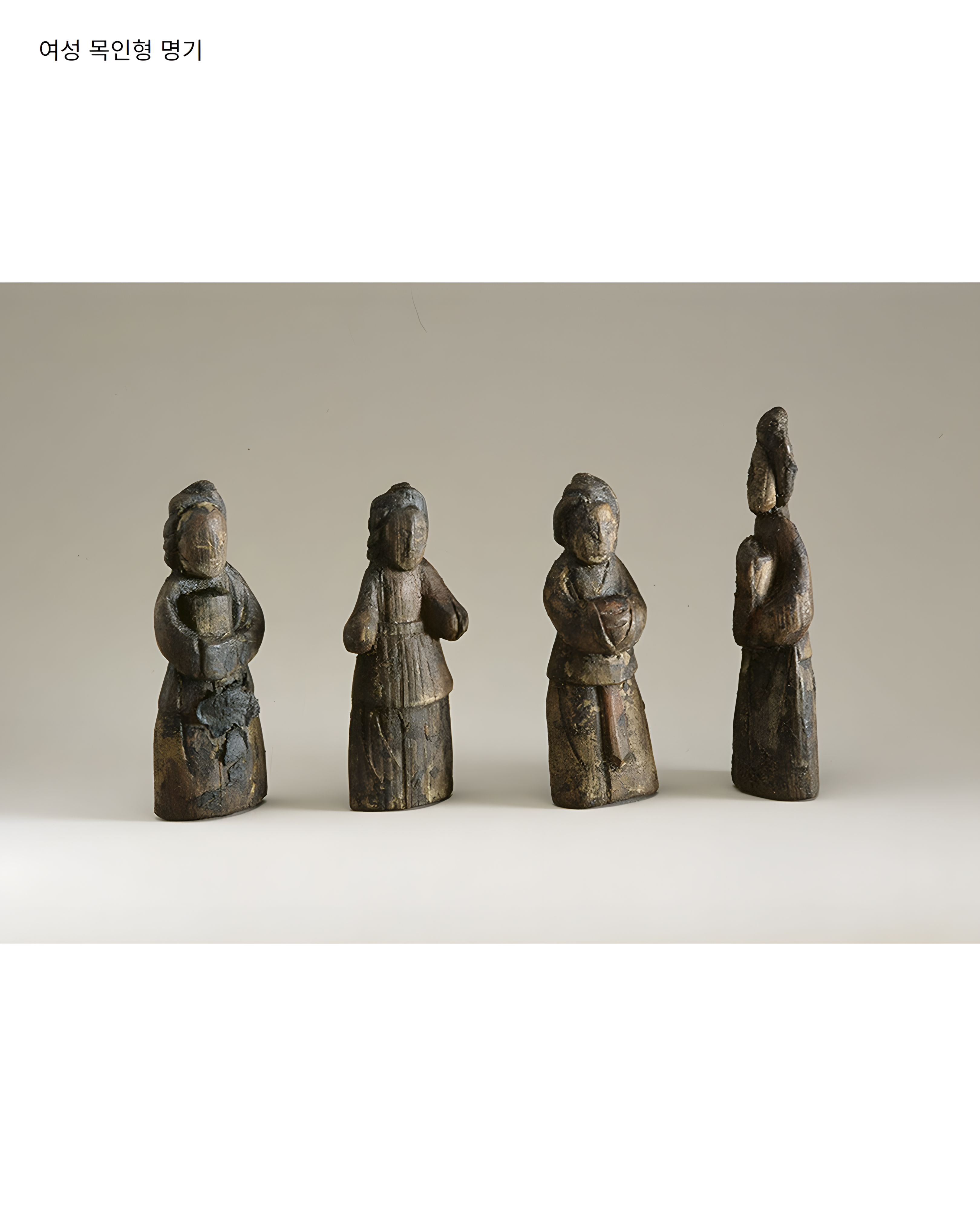 목인형과 목마형 명기는 크기가 6~10센티미터(cm)로 매우 작고 조각 기법도 간결하지만 인물의 표정, 동세가 잘 표현되었습니다.