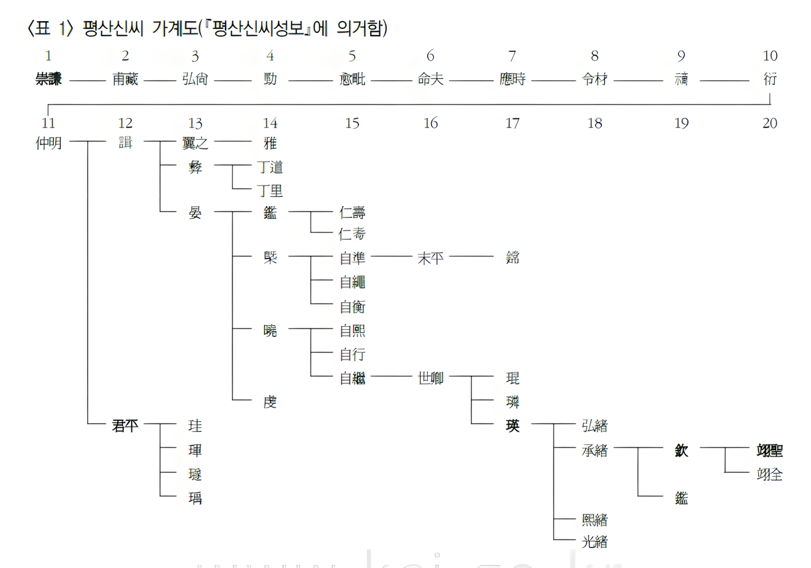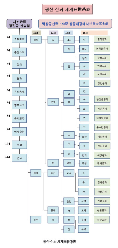 위 평산신씨의 계보를 보면 시조인 신숭겸 부터 11세까지가 단계로만 내려오는데