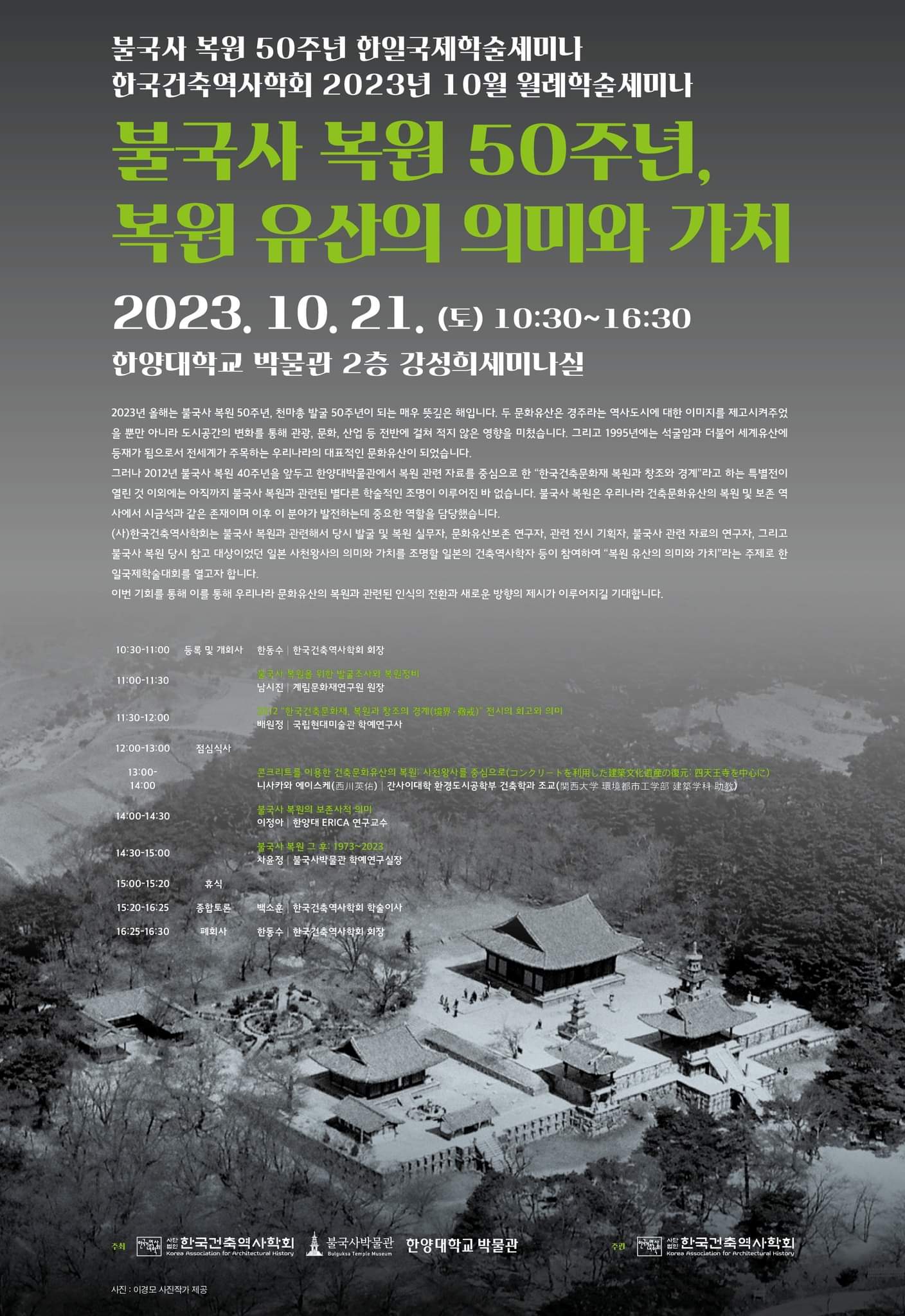 2023년 10월 월례학술세미나_"불국사 복원 50주년, 복원 유산의 의미와 가치" 안내.