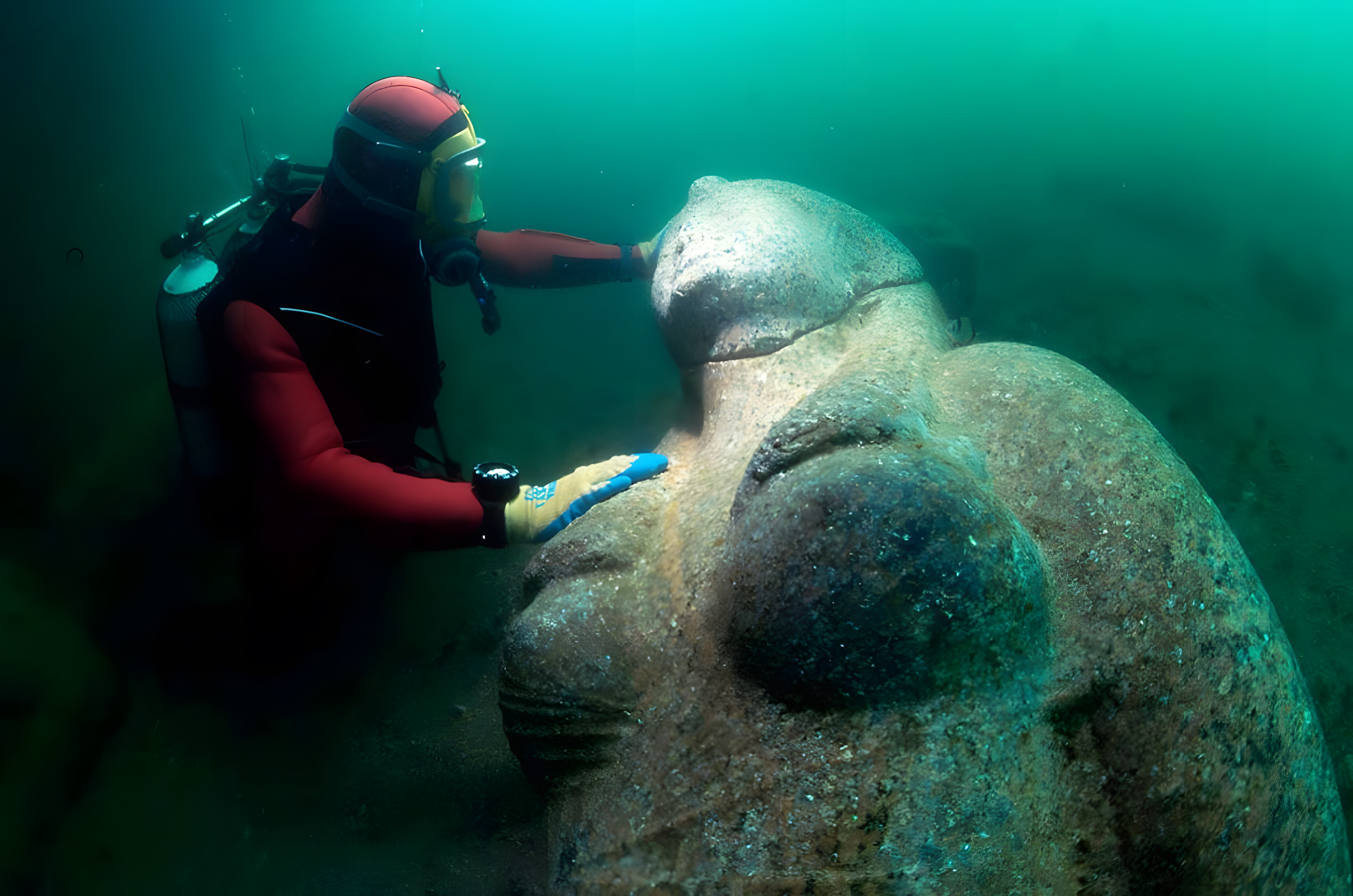 Colossal red granite statue of a Ptolemaic queen, 4.9 m high and weighing 4 tons, found close to the great temple of sunken Thonis-Heracleion. ©Franck Goddio/Hilti Foundation, photo: Christoph Gerigk. 프톨레마이오스 여왕의 거대한 붉은 화강암 조각상으로 높이 4.9m, 무게 4톤으로 가라앉은 토니스-헤라클레이온 신전 근처에서 발견되었다.