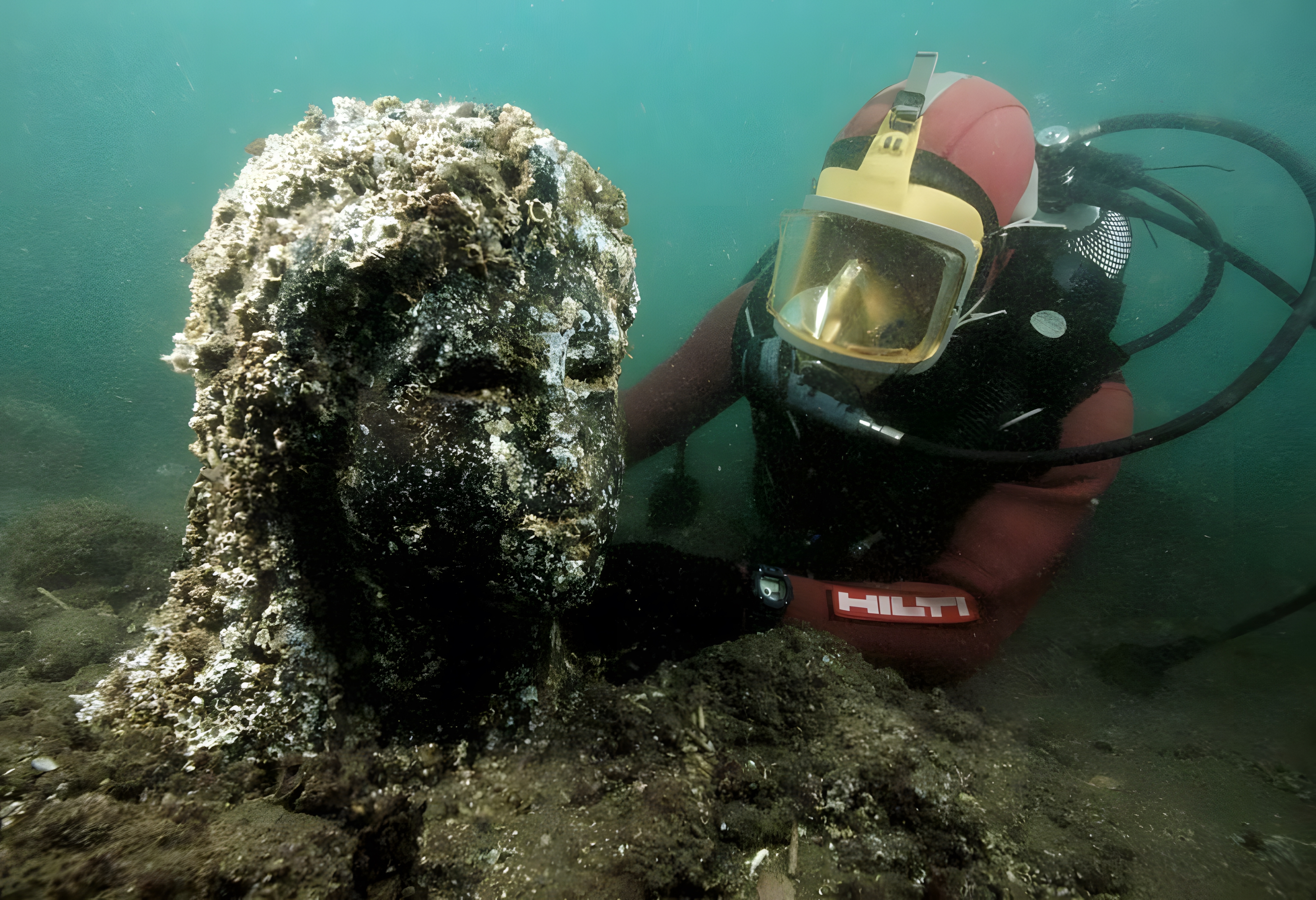 A red granite colossal statue of a Ptolemaic king of over 5 metres height, reassembled underwater after excavation and preliminary cleaning. It was found shattered into 5 fragments close to the main temple in the sunken city of Thonis-Heracleion. ©Franck Goddio/Hilti Foundation, photo: Christoph Gerigk. 붉은색 화강암으로 된 높이 5m가 넘는 거대한 프톨레마이오스 왕 동상. 토니스-헤라클레이온 본당 근처에서 5개 조각으로 부서진 채 발견.