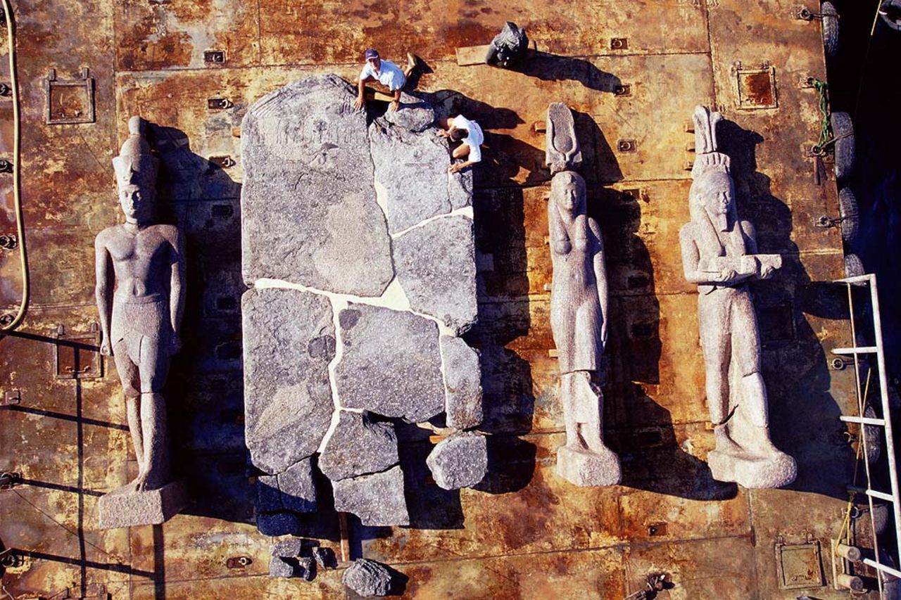 Aerial view of the colossal triad of over 5-metre high red granite statues of a pharaoh, a queen and the god Hapy, which stood in front of the main temple of Thonis-Heracleion. They are placed on apontoon barge together with the 17 fragments of an over 5-metre high 2nd century BC red granitestele in reassembly. The archeologists on the pontoon provide a notion of the dimensions of these artefacts. ©Franck Goddio/Hilti Foundation, photo: Christoph Gerigk. 이 도시 본당 앞에 서 있는 파라오, 여왕, 하피 신의 5m가 넘는 높이의 붉은 화강암 조각상으로 이루어진 거대한 삼신조. 기원전 2세기 붉은 화강암 비석 조각 17개와 함께 재조립된 폰툰 바지선에 놓여 있다.