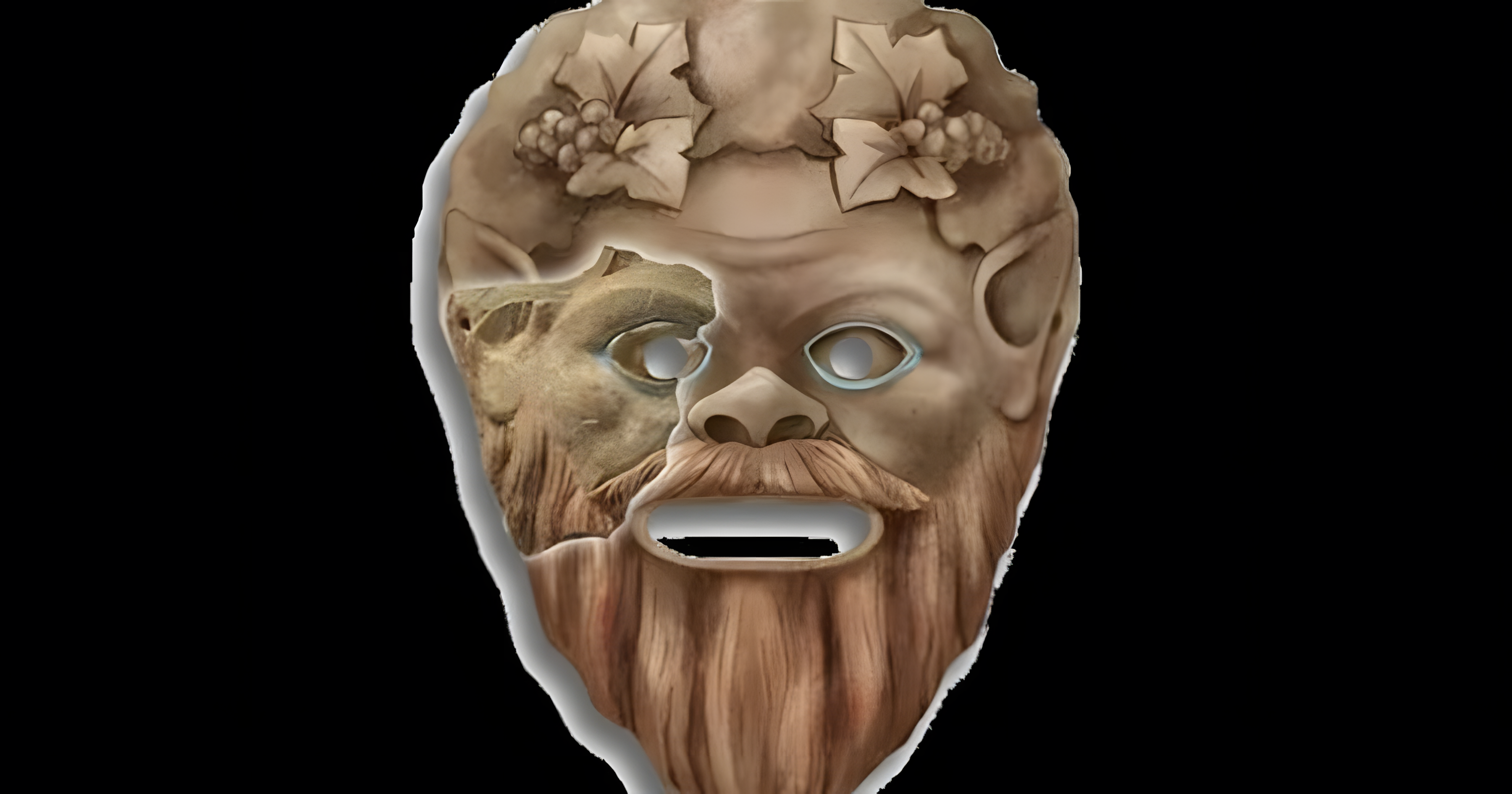 사티로스 가면 조각은 헝클어진 머리와 말굽 모양 콧수염으로 묘사되며. 디오니소스의 이 염소발 시종들의 잘 알려진 도상과 일치한다.