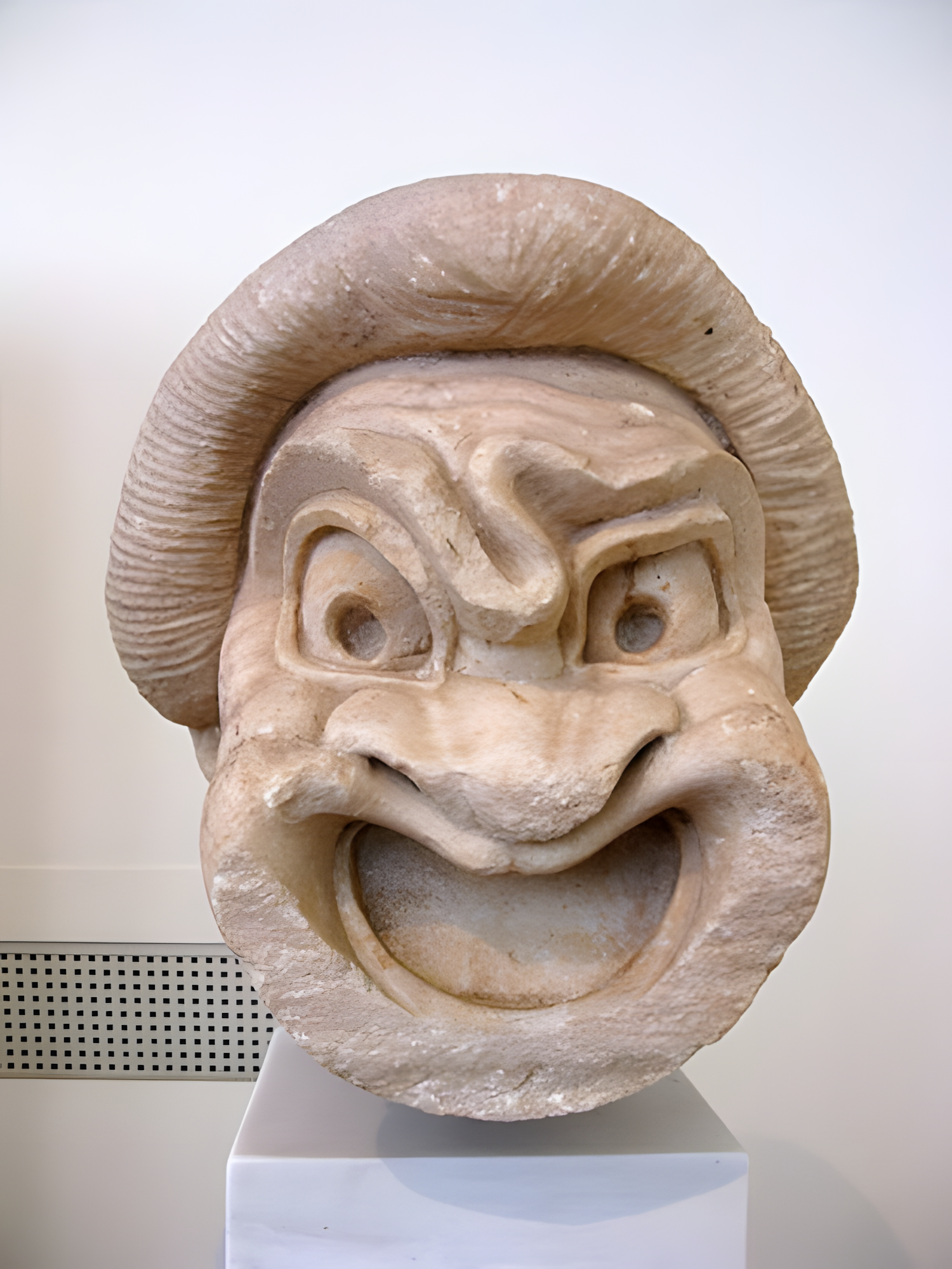 채색된 세부 묘사는 여전히 선명하게 남아 있는데, 푸른색 테두리의 눈과 붉은색 수염과 콧수염은 뉴코미디New Comedy 공연에 사용되는 가면의 특징적인 특징이다.