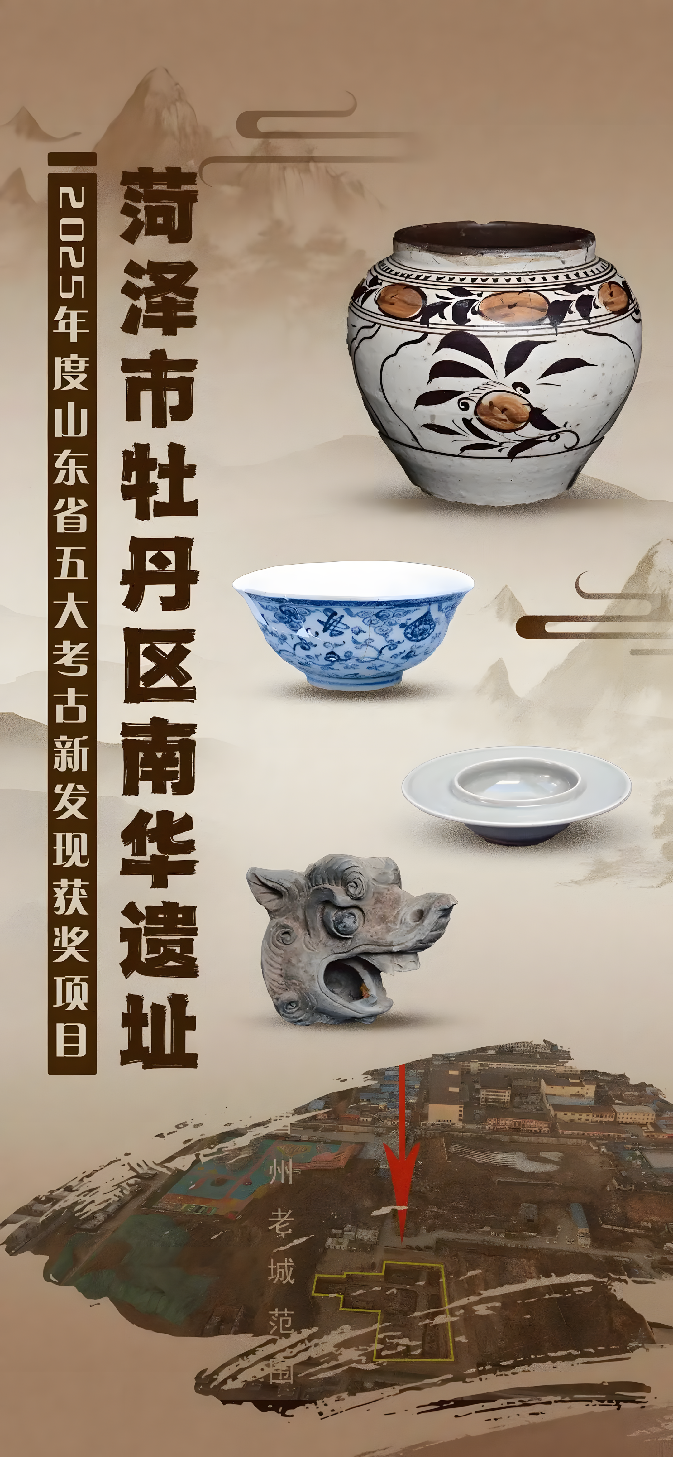 2021년 시작한 노성조주老城曹州 구시가지 복원 사업을 통해 새롭게 발견된 이 유적은 송, 금, 원, 명, 청 왕조 시대 유적이 14만 제곱미터에 걸쳐 중첩되어 나타나는 고대와 근대의 모습이 공존하는 도시 유적이다.