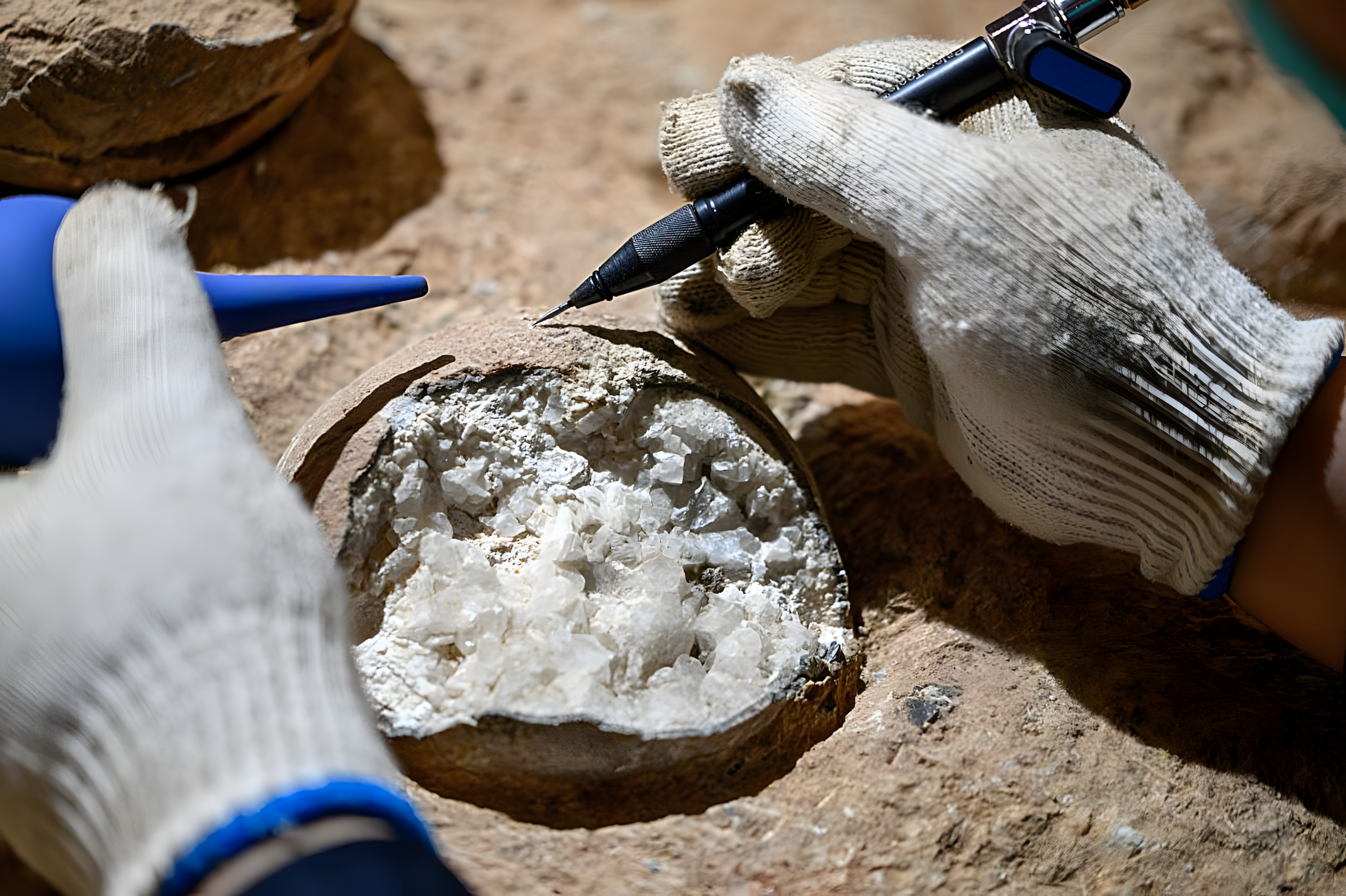 방해석으로 가득 찬 이 공룡알 화석은 각력암을 함유한 실트암에 묻힌 28개 알에서 채취했다.