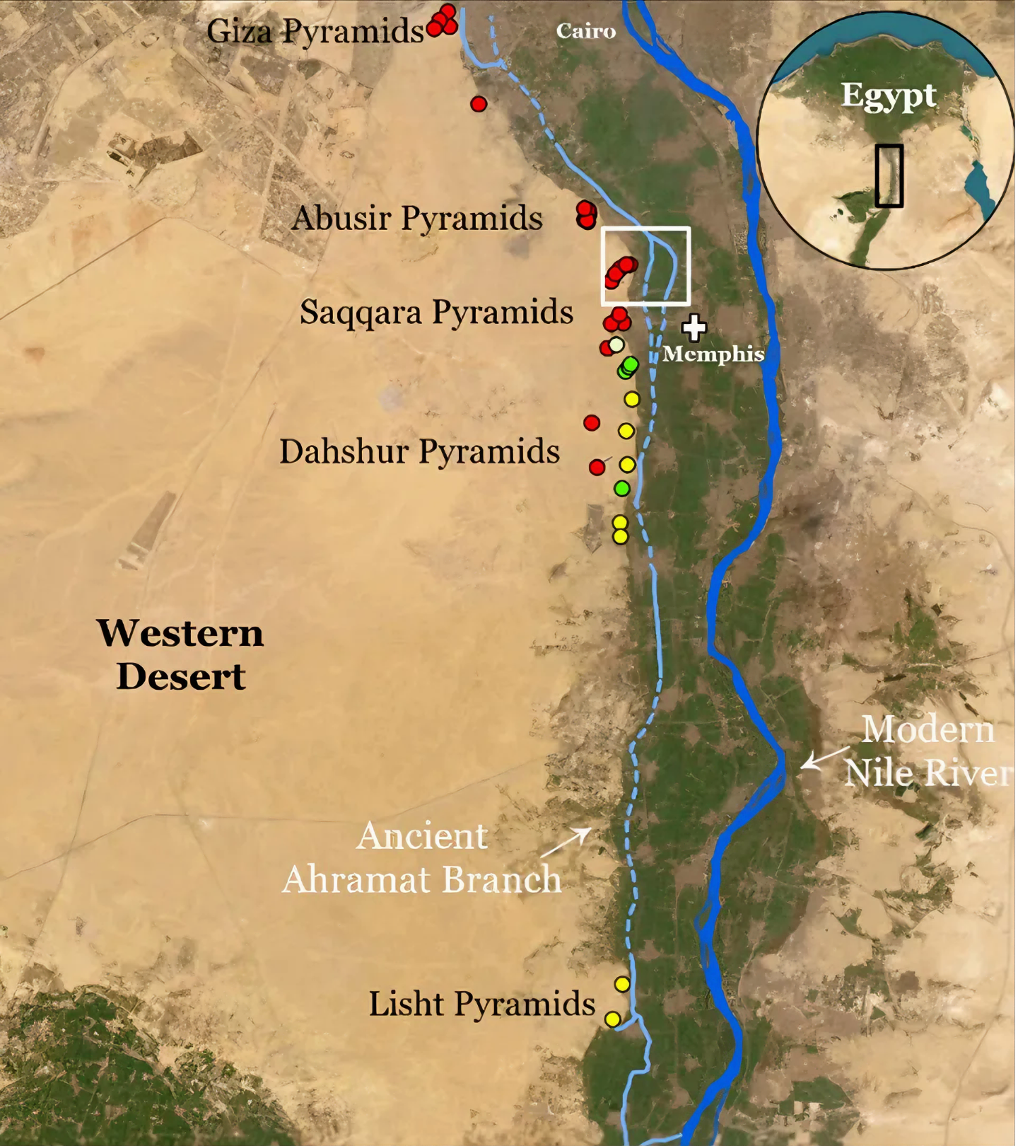 이를 보면 현재의 나일강 물줄기를 기준으로 하면 나일강 서쪽으로 꽤 떨어진 지점에 피라미드들이 들어서 있지만,