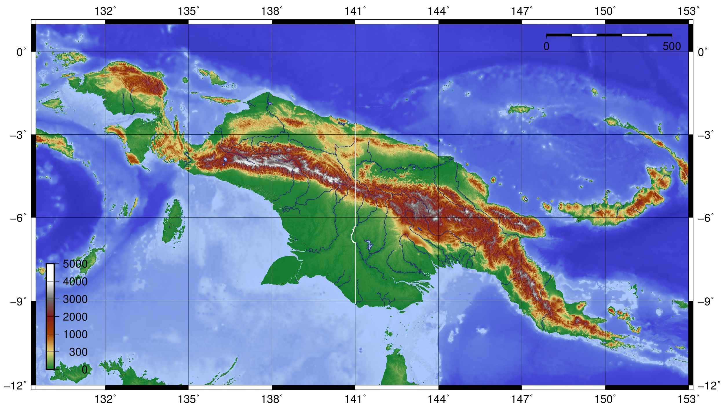 동쪽 절반은 1975년 독립국이 된 파푸아뉴기니Papua New Guinea 대부분을 차지한다.