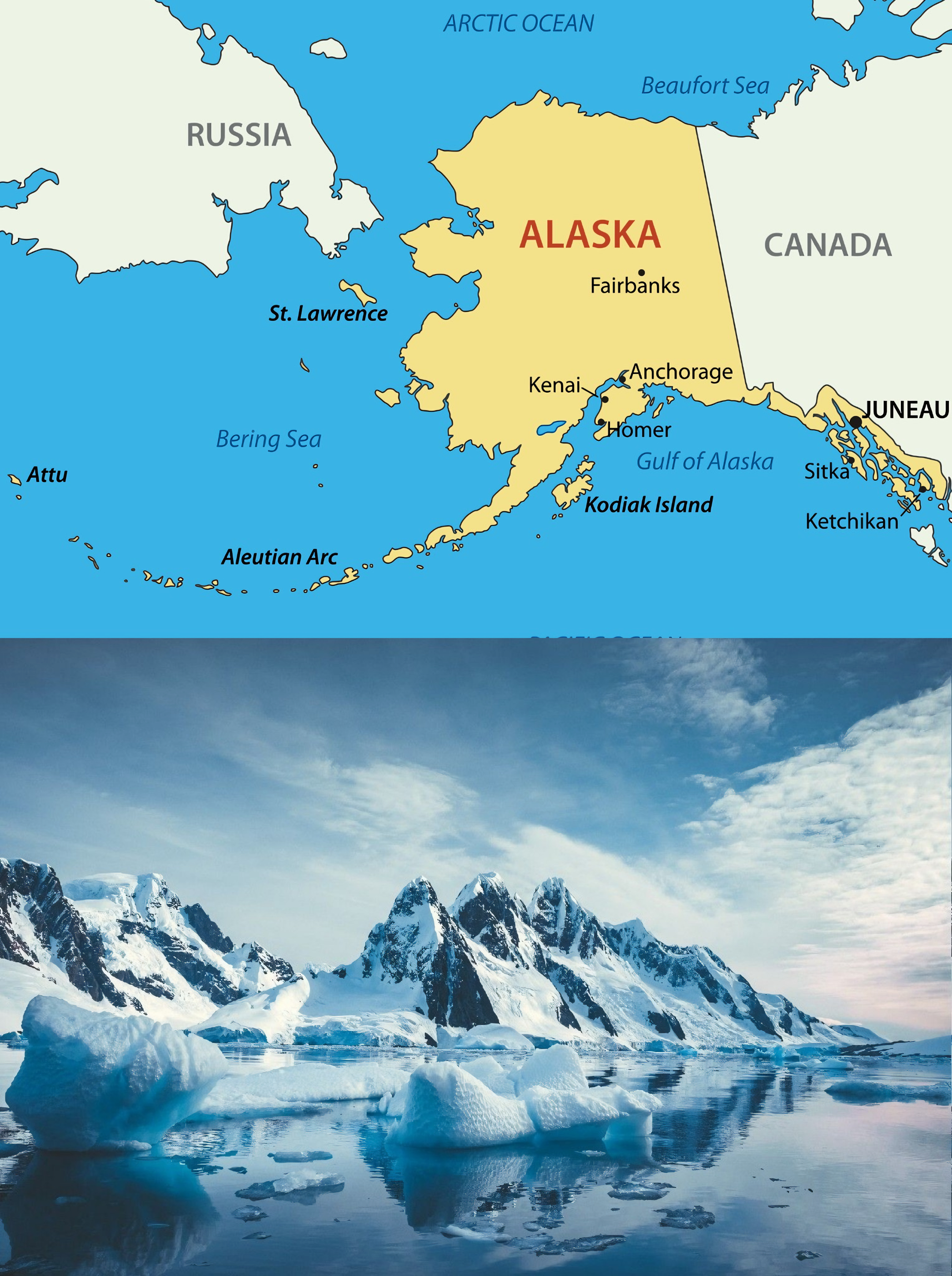 미국 북서쪽 끝에 위치한 알래스카는 동쪽으로는 캐나다와 접하고, 태평양과 북극해를 마주 보며 다른 미국 주들과 지리적으로 분리되어 있다.