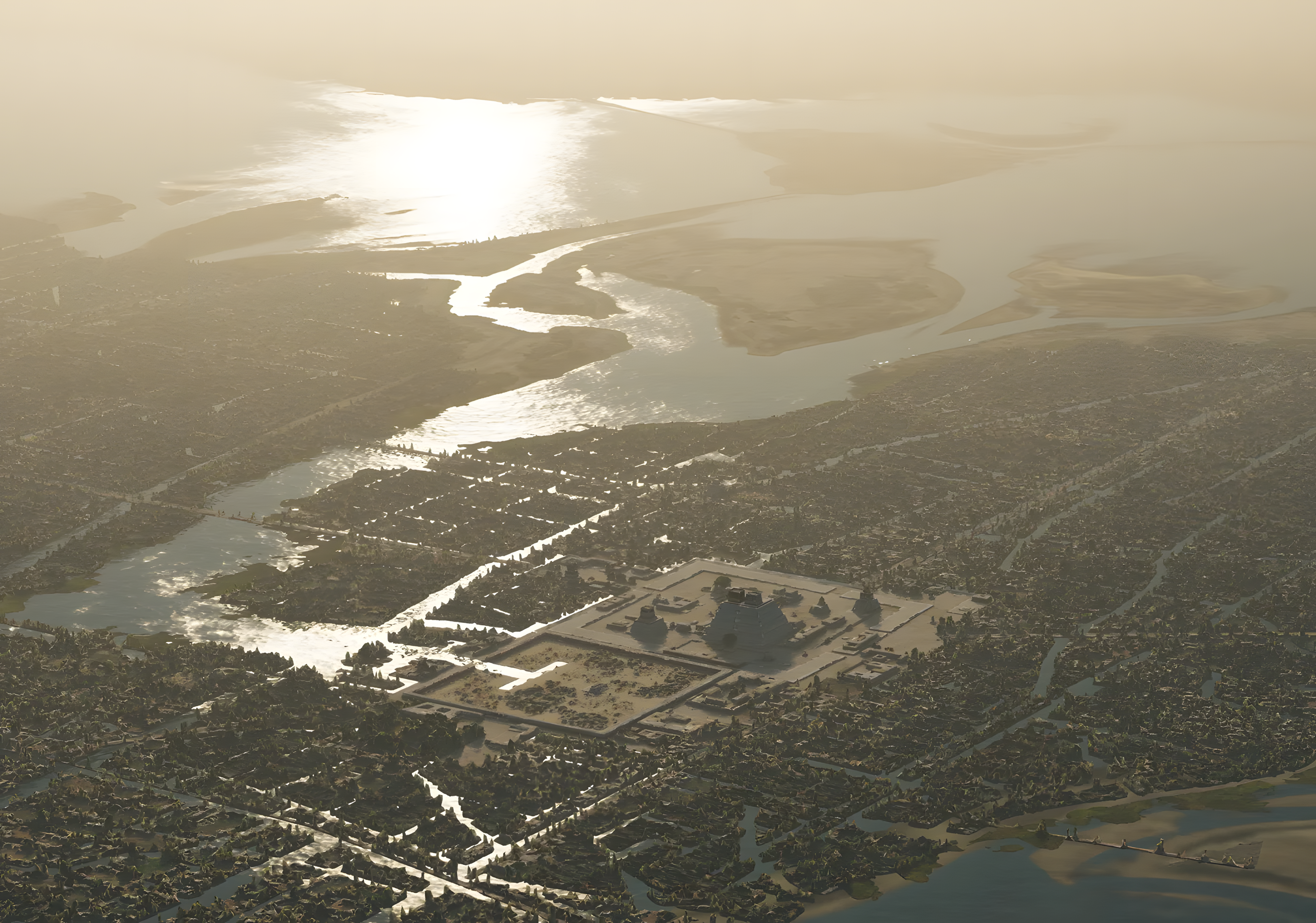텍스코코 호수Lake Texcoco 위로 햇살이 반짝이고, 멀리 화산에서는 연기가 피어오르며, 그 아래로는 집들과 치남파들chinampas이 펼쳐진다.